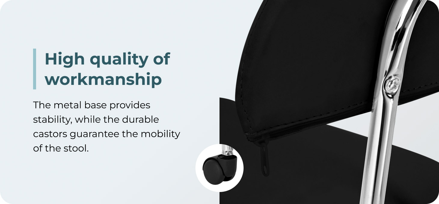 The five-star base in shades of chrome is equipped with wheels that ensure significant mobility, making it easy to move the furniture around the salon. The upholstery of the stool is made of pleasant-to-touch imitation leather in shades of black. Thanks to the use of such material, the stool is durable, moisture-resistant and easy to clean.