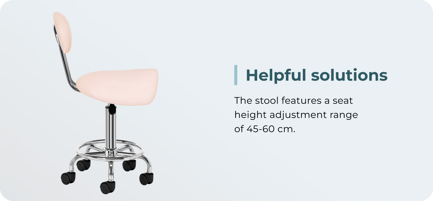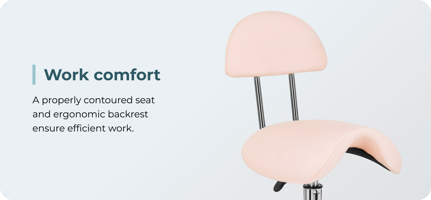 The ability to adjust the seat height in the range of 49-62 cm makes it easier for the specialist to properly position the body while performing services. The seat profiled in the shape of a saddle filled with durable, deformation-resistant foam guarantees users comfort and ergonomics of work. The comfortable backrest provides excellent back support, regardless of the user's height. The full rotation mechanism makes work more effective and comfortable.
