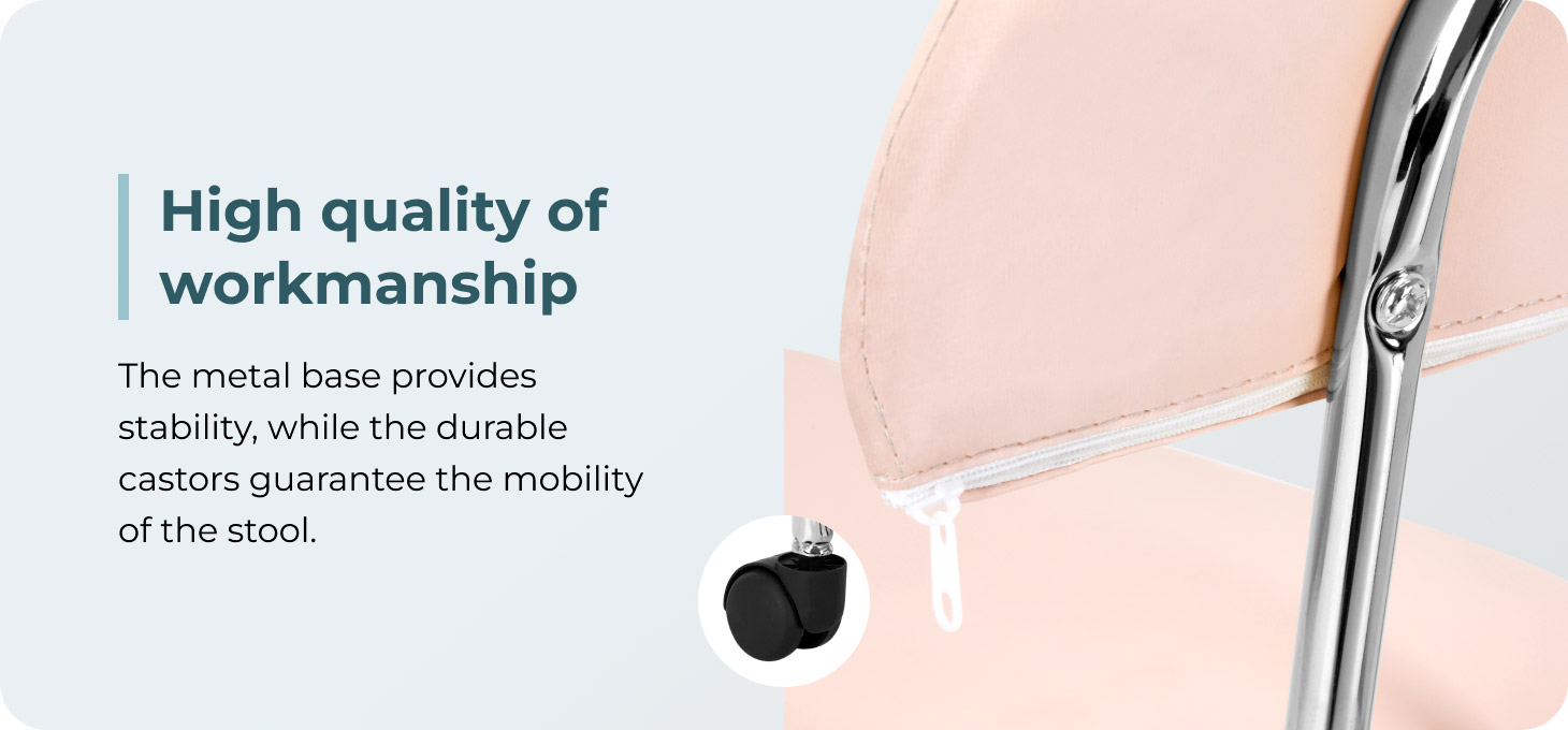 The five-star base in shades of chrome is equipped with wheels that ensure significant mobility, making it easy to move the furniture around the salon. The upholstery of the stool is made of pleasant-to-touch imitation leather in shades of pink. Thanks to the use of such material, the stool is durable, moisture-resistant and easy to clean.