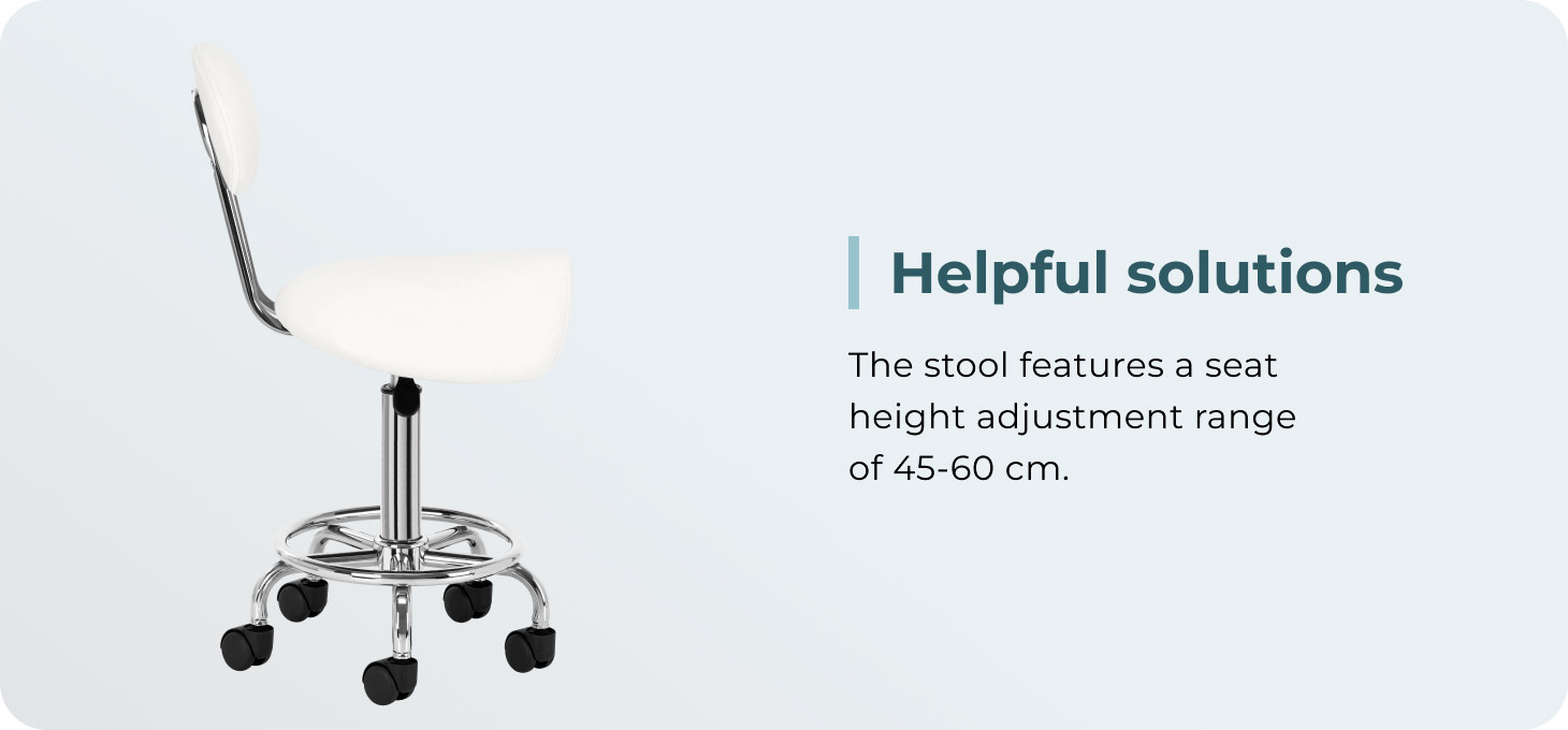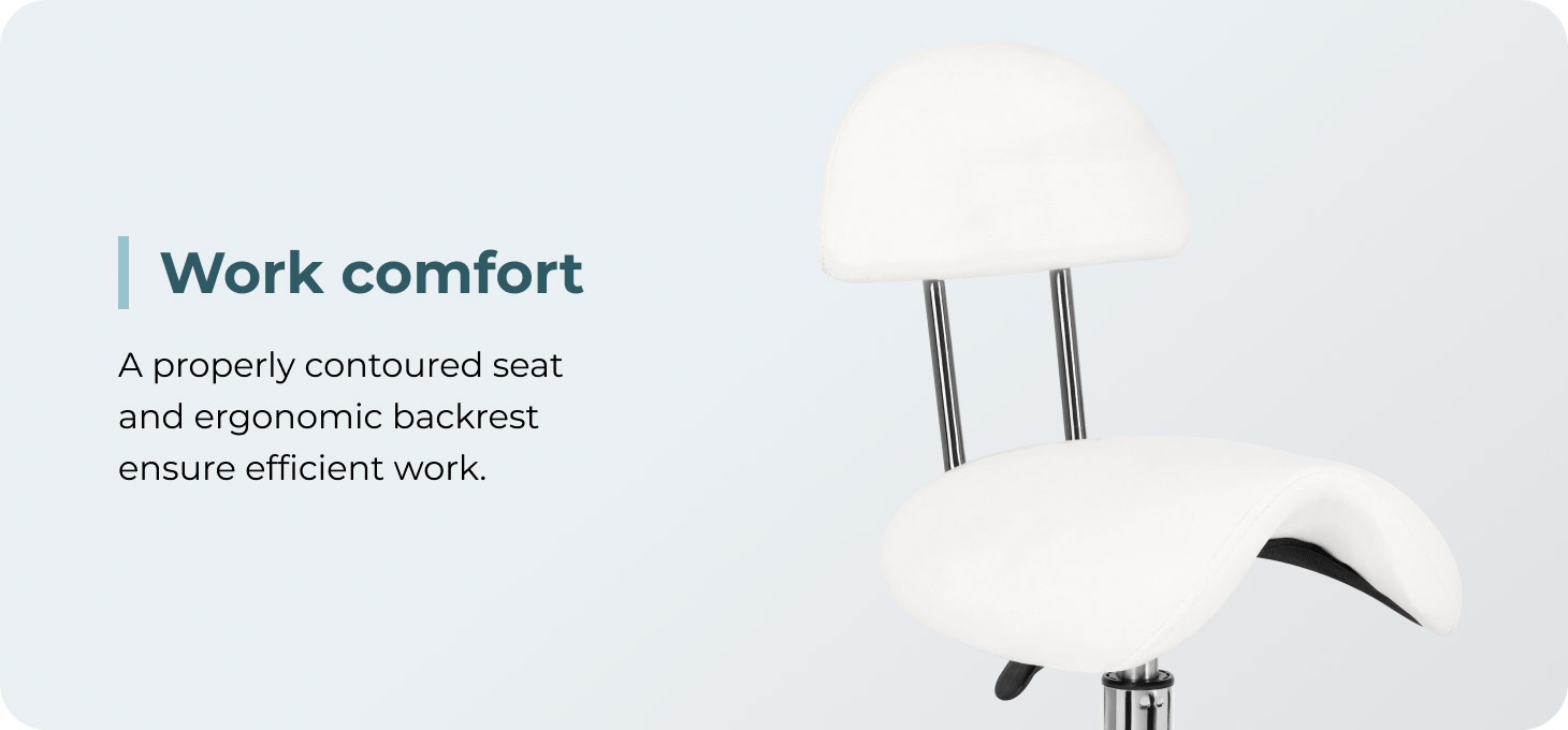 The ability to adjust the seat height in the range of 49-62 cm makes it easier for the specialist to properly position the body while performing services. The seat profiled in the shape of a saddle filled with durable, deformation-resistant foam guarantees users comfort and ergonomics of work. The comfortable backrest provides excellent back support, regardless of the user's height. The full rotation mechanism makes work more effective and comfortable.