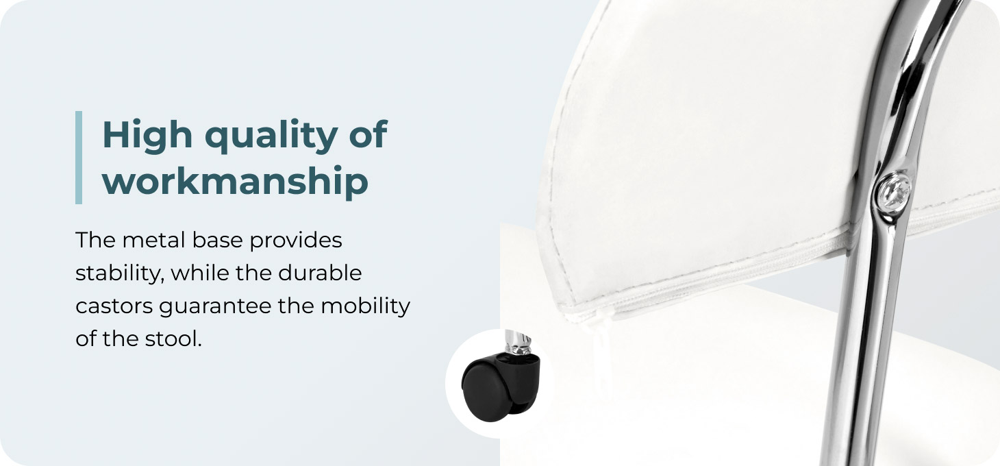 The five-star base in shades of chrome is equipped with wheels that ensure significant mobility, making it easy to move the furniture around the salon. The upholstery of the stool is made of pleasant-to-touch imitation leather in shades of white. Thanks to the use of such material, the stool is durable, moisture-resistant and easy to clean.