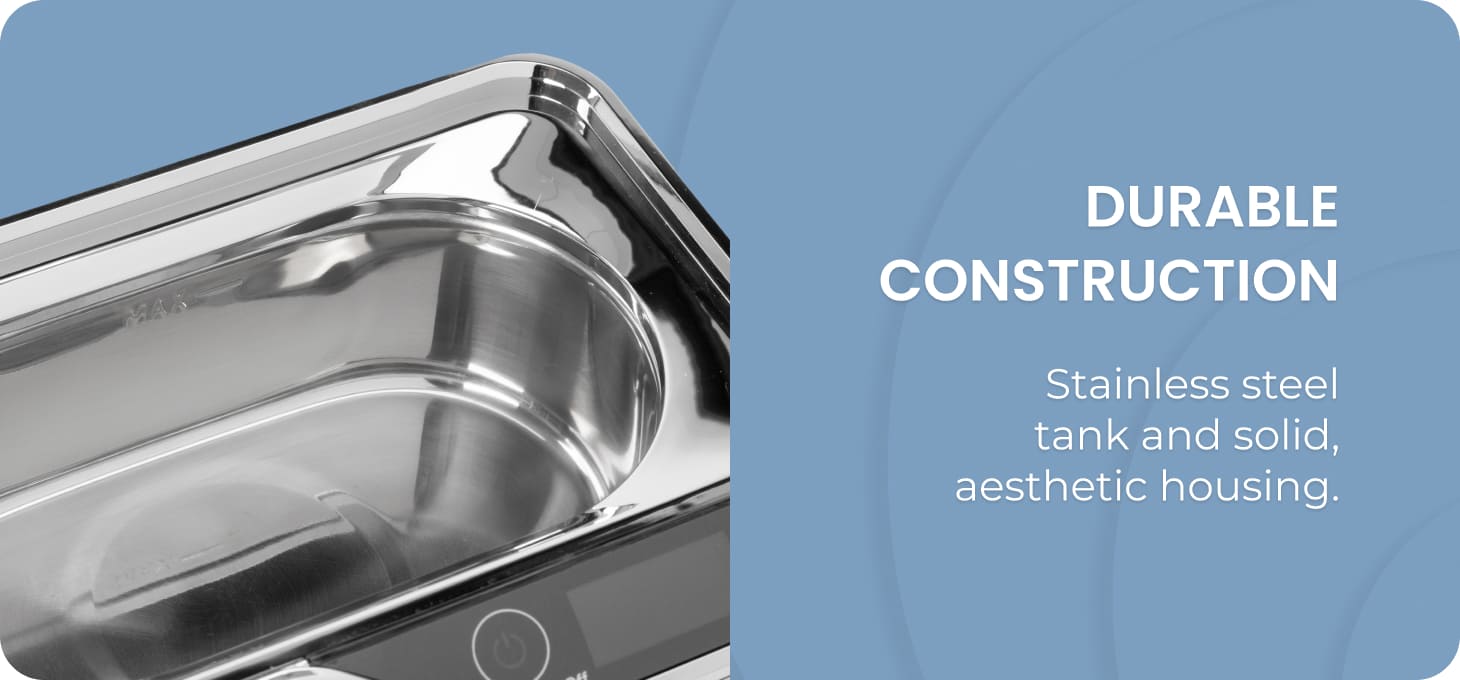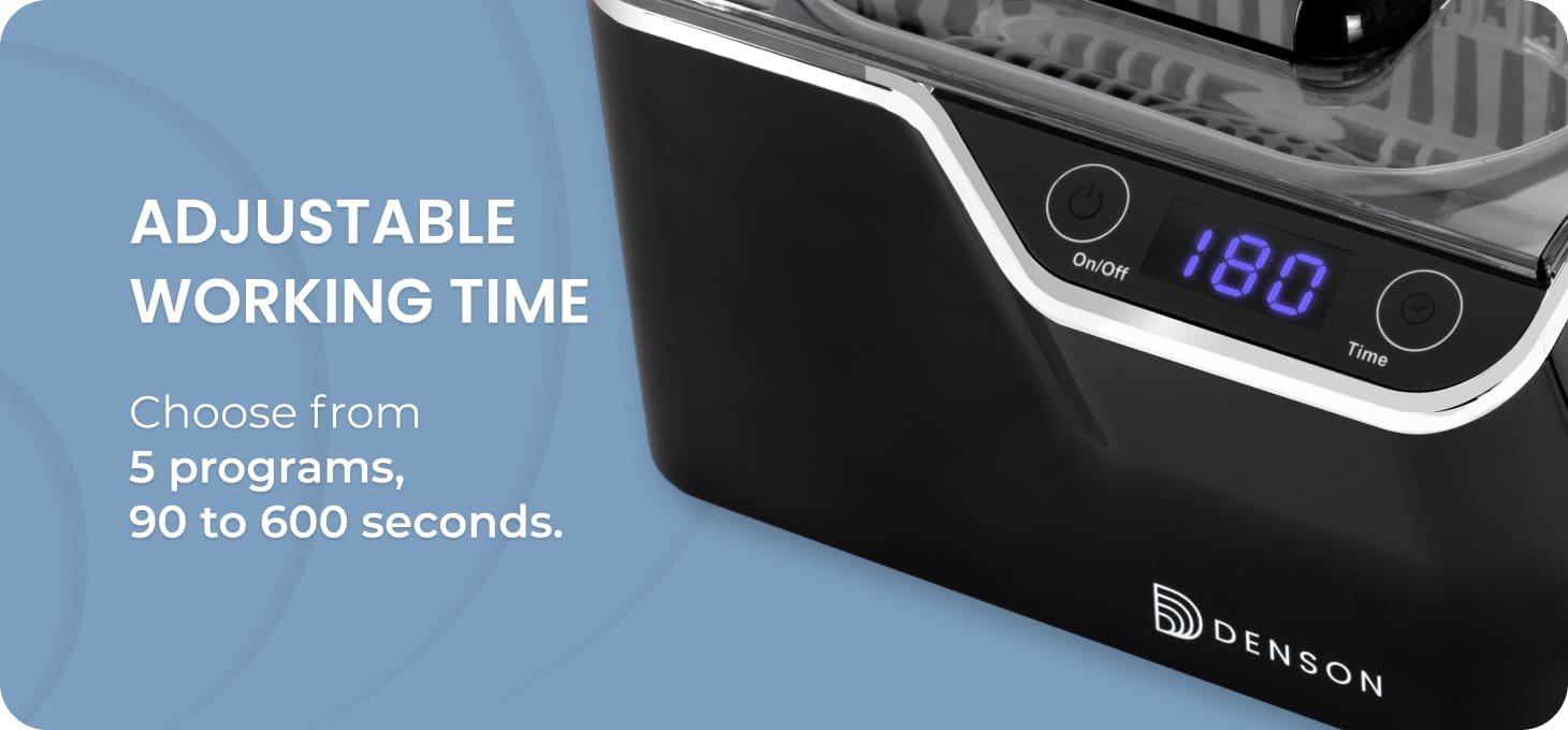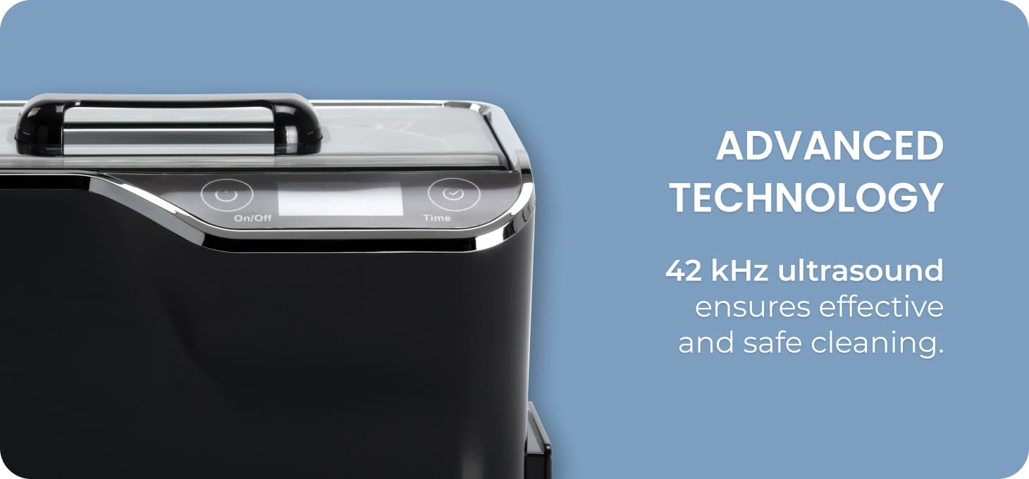 A practical display panel allows you to select one of five cleaning time settings – 90, 180, 300, 480 or 600 seconds – allowing you to customize the process to the type and degree of soiling. The 42 kHz ultrasonic frequency ensures thorough cleaning while maintaining the safety of delicate surfaces. To increase cleaning effectiveness, disinfectant fluids can be used, maintaining the concentrations recommended by the manufacturers.