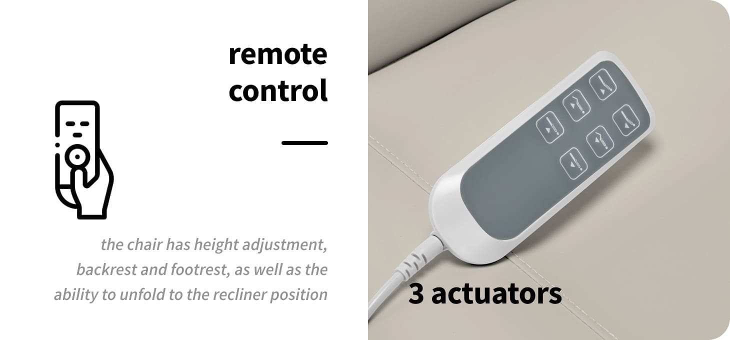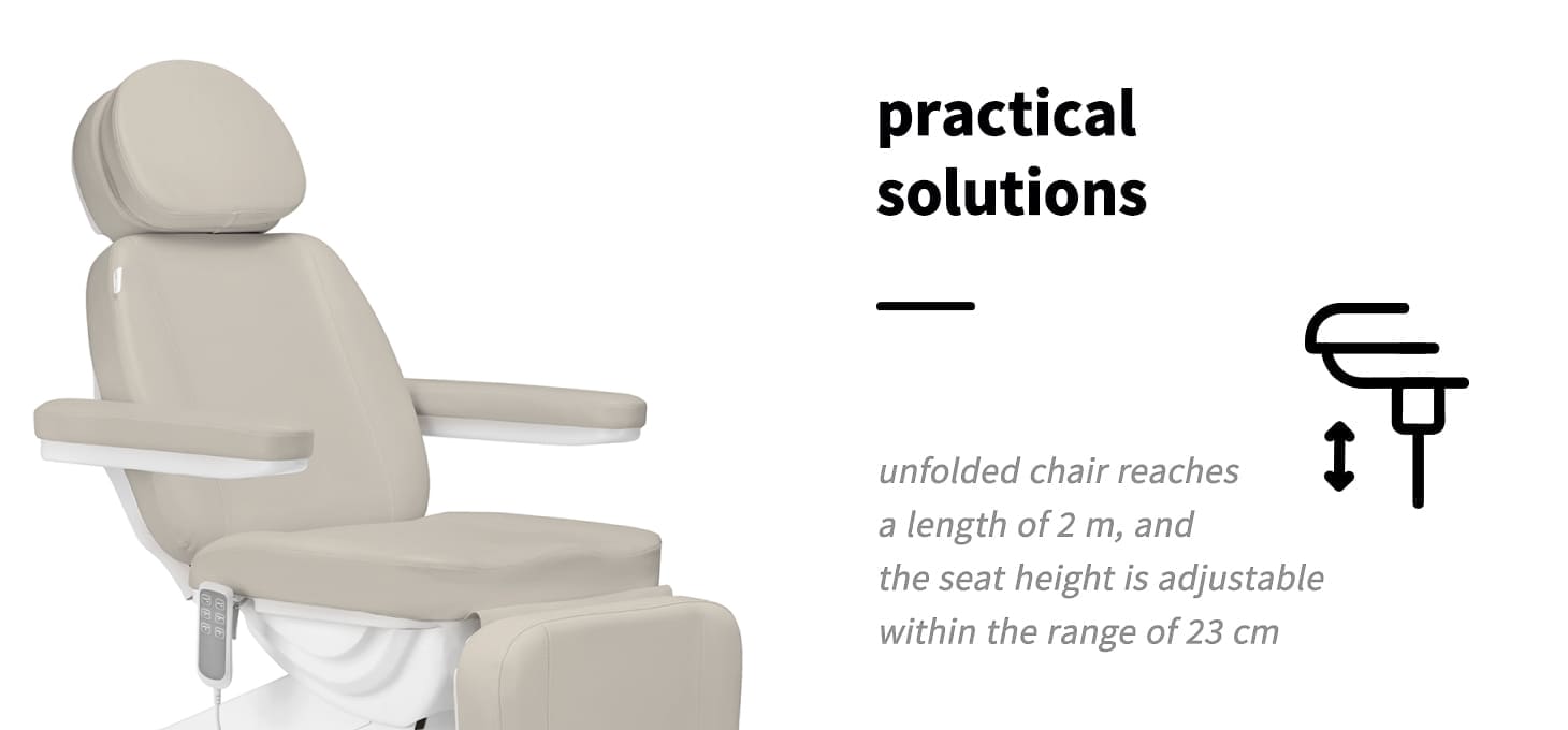 Using an easy-to-use remote control, the chair adjusts smoothly in 3 planes – it is adjustable in height, backrest and footrest. The seat height can be adjusted from 61 cm to 84 cm, and when fully extended the chair reaches a length of 2 m. These dimensions allow the equipment to be easily used by people of different heights and allow it to be adapted to the current treatment and individual needs, which affects both the comfort of the user and the person performing the service. The handles located on both sides of the seat allow the remote control to be hung up so that it is always at hand.