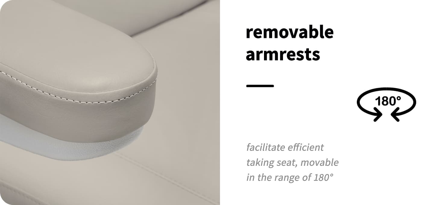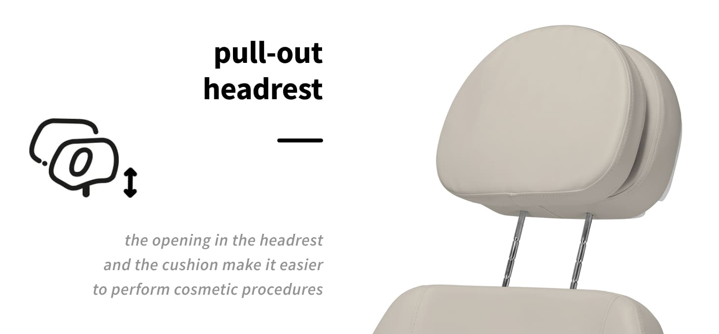 The extendable headrest helps customize the equipment for users of different heights, providing stable head support during treatments. It is also possible to adjust the extension of the footrest, which is especially useful during treatments performed on taller people, providing them with better support. The armrests are movable within 180º, which facilitates taking a seat in the chair and provides comfortable access for the person performing the procedure. They can be easily and quickly removed if necessary.