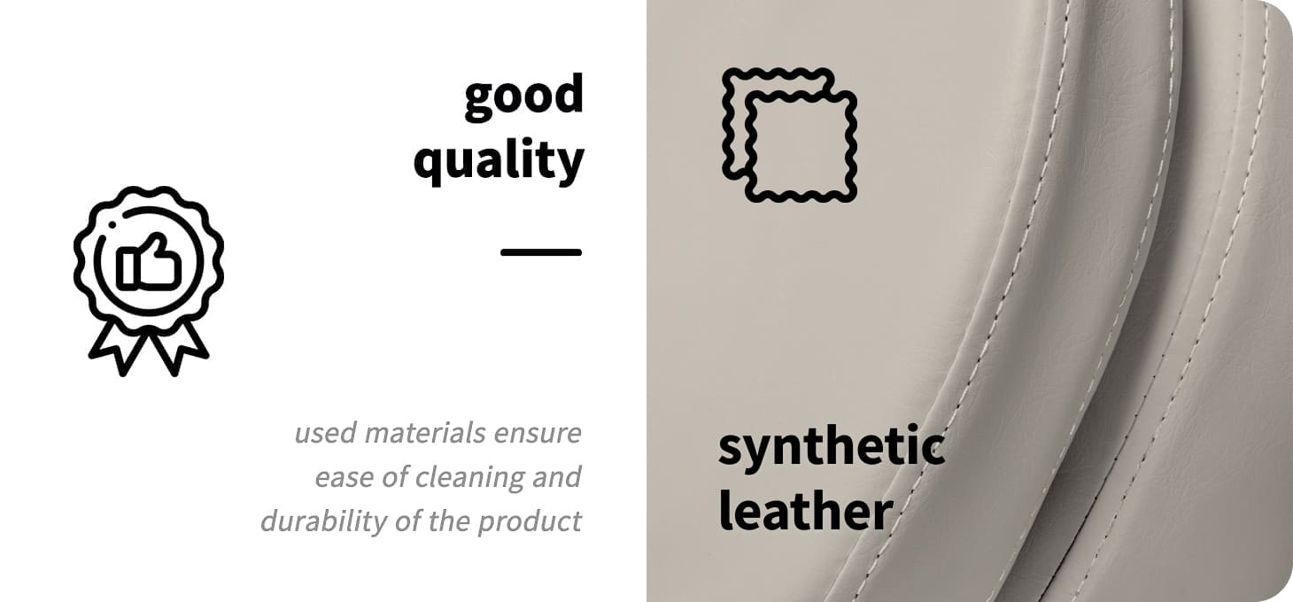 The chair is filled with contoured foam and covered with pleasant-to-touch synthetic leather in shades of beige. The material used makes the equipment easy to clean, as well as resistant to moisture and selected disinfectants. A solid base made of durable material in shades of white ensures stability during treatments. Properly profiled hems give the chair a stylish look and make the seat ergonomic. Minimalist, simple design and classic colors allow it to fit into any interior.