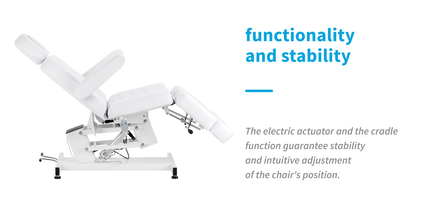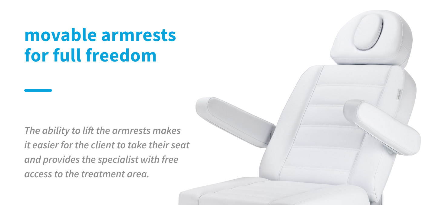 The wide seat ensures a high level of comfort even during longer treatments. Movable armrests with a lift function make it easier for the client to sit down in the chair and provide easy access for the person performing the treatment. The chair is equipped with a headrest that can be extended by 20 centimetres, which guarantees stable head support and additional comfort, especially for taller users. The opening in the headrest, hidden under a cover, increases comfort when lying down, especially during treatments performed on the back. Well-thought-out design solutions translate into customer comfort and ergonomic working conditions for the specialist.