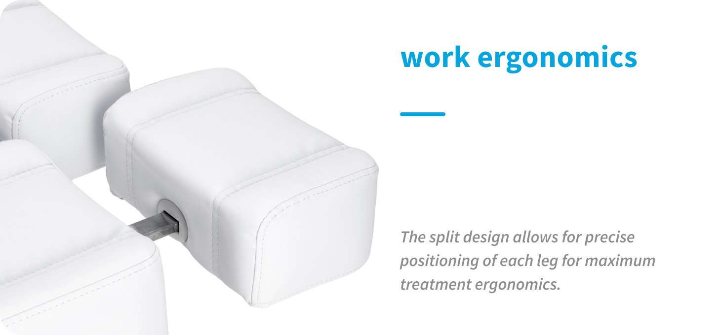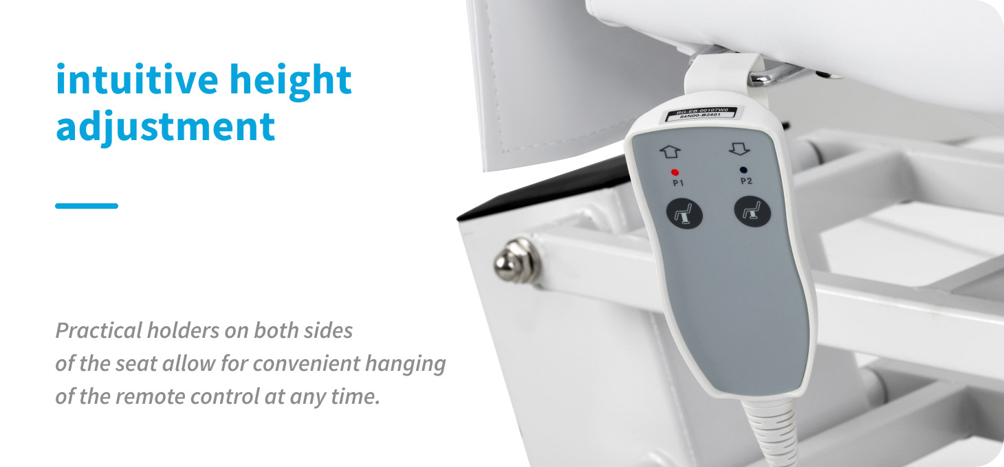 A wired remote control allows the seat height to be adjusted within a range of 63-85 cm. The adjustment range allows the position to be easily adjusted to the type of treatment being performed, taking into account the comfort of the client and the ergonomics of the specialist's work. For added convenience, the remote control can be hung on holders located on both sides of the seat.