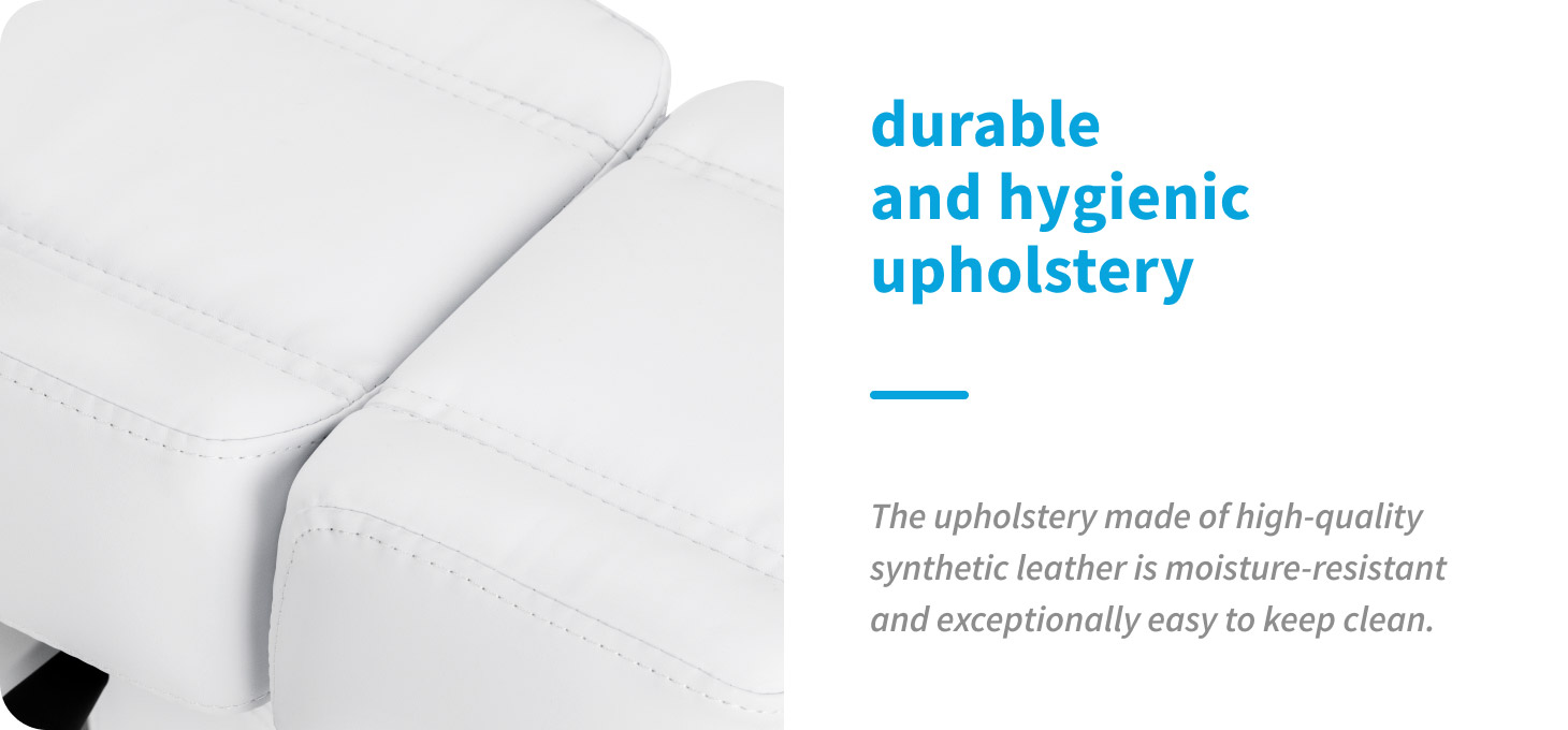 The solid construction of the chair ensures stability and durability, and the seat filled with foam of appropriately selected hardness guarantees comfort even during long treatments. The upholstery made of high-quality, pleasant to the touch synthetic leather in shades of white gives the whole a professional look, and at the same time is moisture-resistant and easy to keep clean. The durable base and precise finishes emphasise the modern character of the chair and contribute to the ergonomics of the seat.
