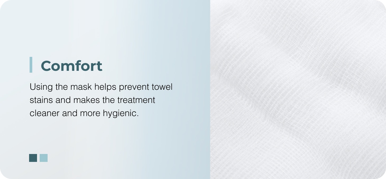 The use of the mask keeps the product on the skin, prevents towels from getting dirty and makes the treatment cleaner and more hygienic. The product is intended for single use and facilitates the maintenance of hygienic working conditions.