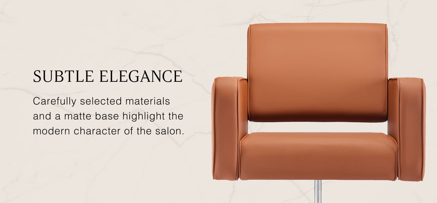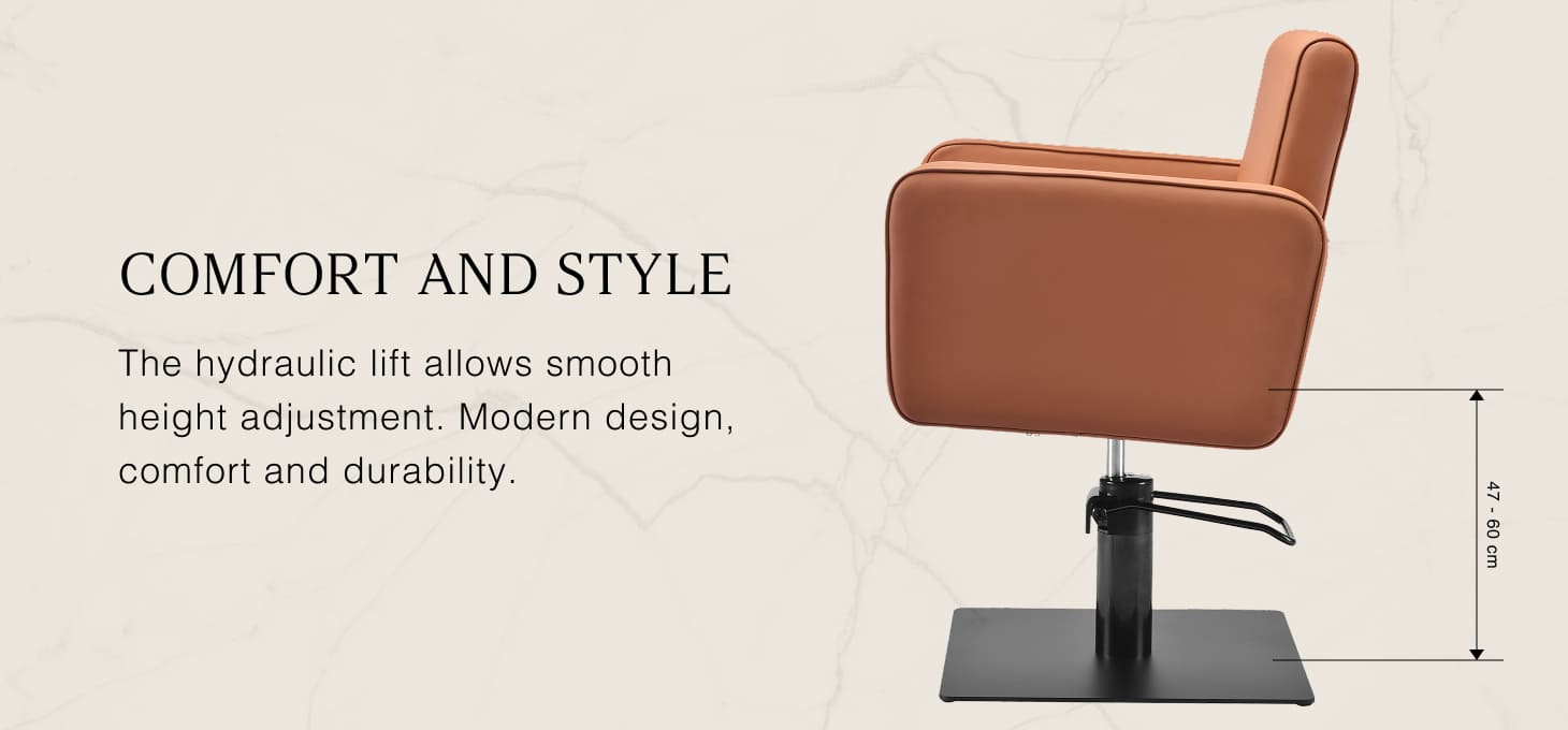 The Gabbiano Bilbao hairdressing chair combines minimalist design with functionality and everyday comfort. Subtly rounded lines give it a light and modern feel, while the stable, square base in matte black emphasises its stylish appearance. The soft padding combined with pleasant-to-the-touch synthetic leather in shades of brown ensures comfort even during long treatments. Carefully selected materials ensure durability, moisture resistance, and ease of cleaning. The chair complements both modern and classic interiors, giving the salon a professional character.