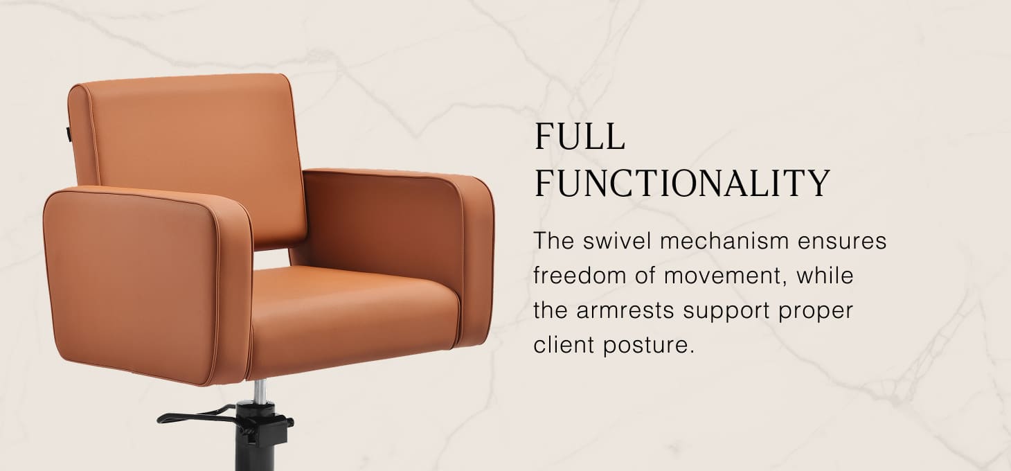 The seat guarantees comfort even during long treatments. Ergonomic armrests support the client's correct posture, ensuring comfort and facilitating precise cuts and styling. The full rotation mechanism provides greater mobility and freedom of movement, making hairdresser's work smoother, more efficient, and less stressful. An additional convenience is the practical opening between the backrest and seat, which facilitates cleaning and quick hair removal from hard-to-reach areas. This allows for efficient and hygienic preparation of the station for the next client.