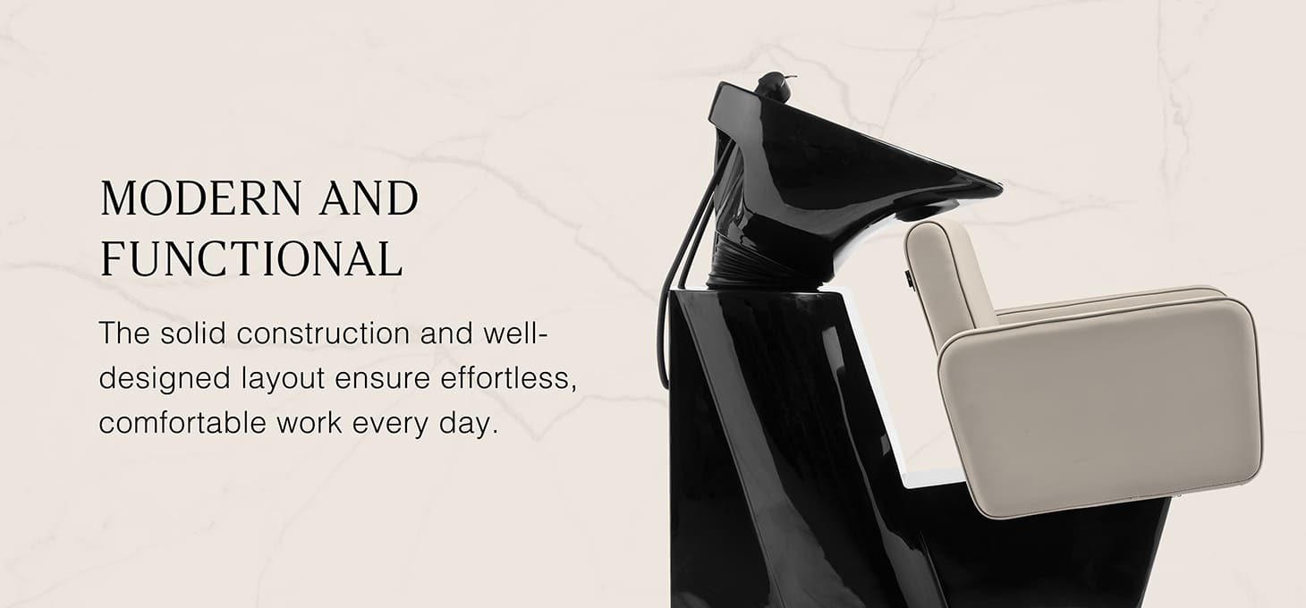 The wash unit is equipped with a mixer tap that provides constant access to hot and cold water and allows for easy temperature adjustment to the client's needs. A practical place to put the shower head simplifies station organisation, while a plug with a special strainer allows you to control the water flow and maintain a high level of hygiene. The water connection is located inside the base, aesthetically concealing the plumbing. The chair is designed for maximum comfort during a variety of treatments. The combination of functional solutions and ergonomic details makes everyday work efficient and comfortable.