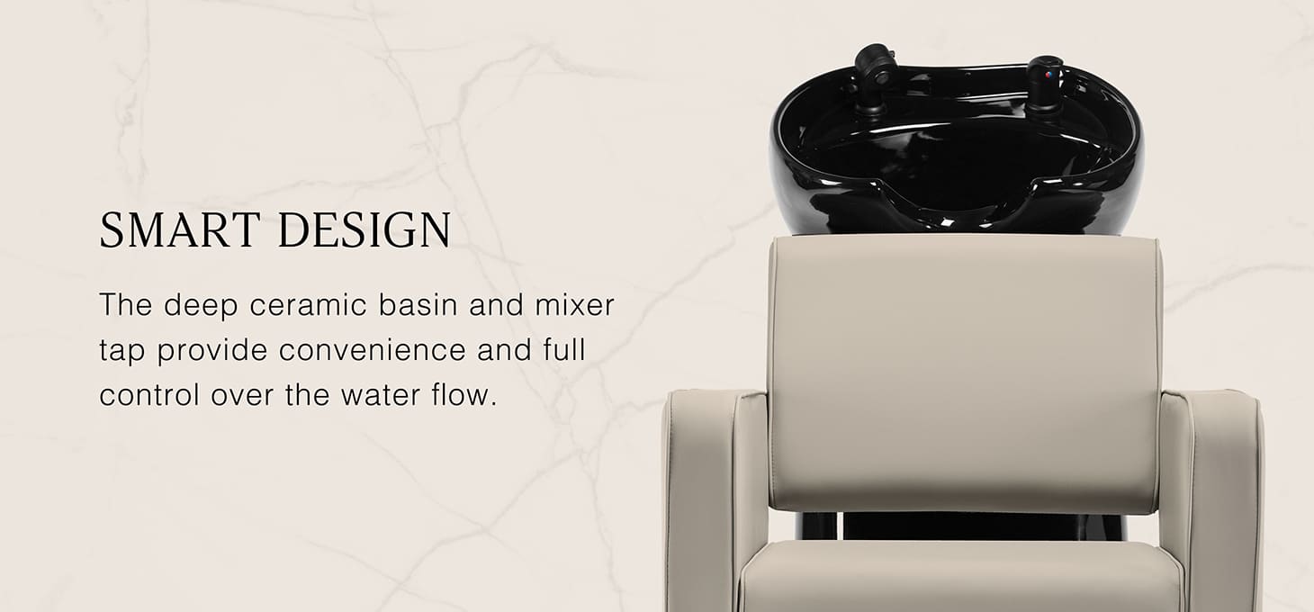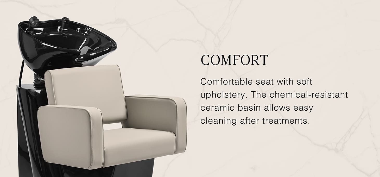 The deep ceramic bowl in shades of black minimises splashing of water and cosmetics during treatments. The adjustable bowl angle allows for precise adjustment to the customer's needs. Made of durable material, it is resistant to discolouration, scratches and chemicals, and its smooth surface makes it easy to keep clean. The ergonomically profiled collar provides comfortable head support, while the black plastic cover eliminates the feeling of cold when touching the ceramic.
