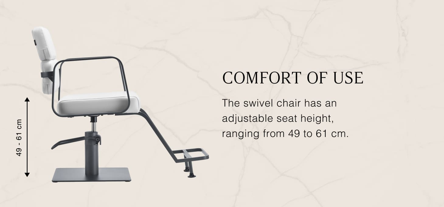 The durable hydraulic lift allows you to adjust the seat level within the range of 49-61 cm - even when the client is sitting on the chair. It ensures more ergonomic work, allowing you to adjust the seat level to the height of both the client and the hairdresser. The visually interesting backrest allows you to take a convenient position, providing excellent back support, which is especially important in the case of long-hour treatments. A big advantage of this model is the hole left between the backrest and the seat. It makes it easier to keep the salon clean by allowing you to easily sweep hair from every nook and cranny of the chair. This allows you to streamline the preparation of the workstation between clients.