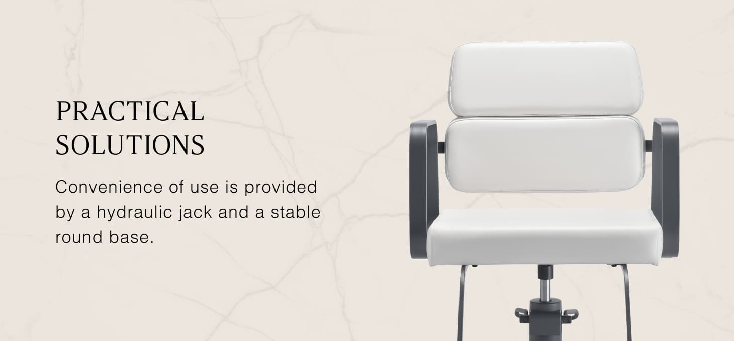 The full rotation mechanism of the chair makes the hairdresser's work more effective and comfortable. A solid, flat, square-shaped base guarantees stability during use. The matte-finished, smooth surface gives the element an elegant look and makes it easy to keep clean. A comfortable seat with foam filling ensures high comfort of use, even during many hours of treatments. Geometric, metal armrests allow for the correct positioning of the client's shoulders – this means that he does not bury his head in his shoulders or slouch – which makes it much easier to perform precise treatments, including haircuts. A stylish footrest dedicated to this model provides stable support for the user's feet.