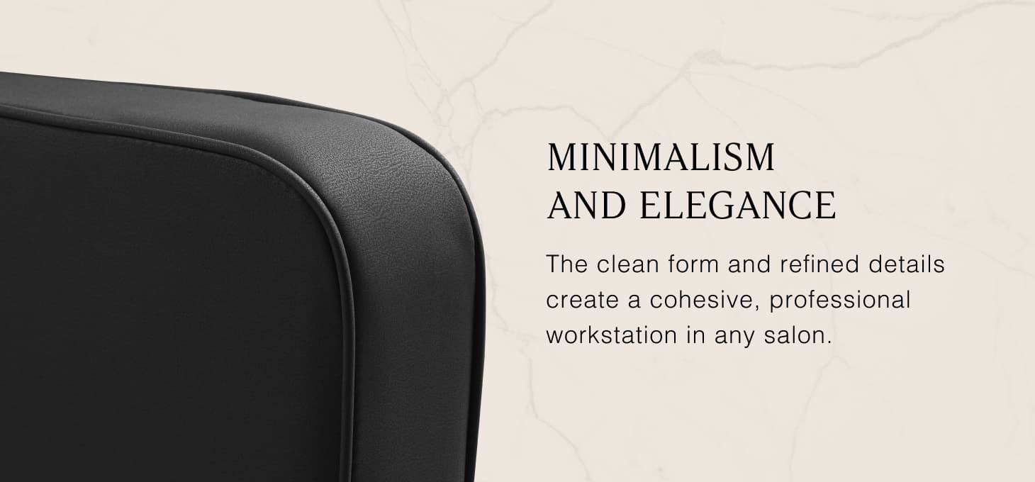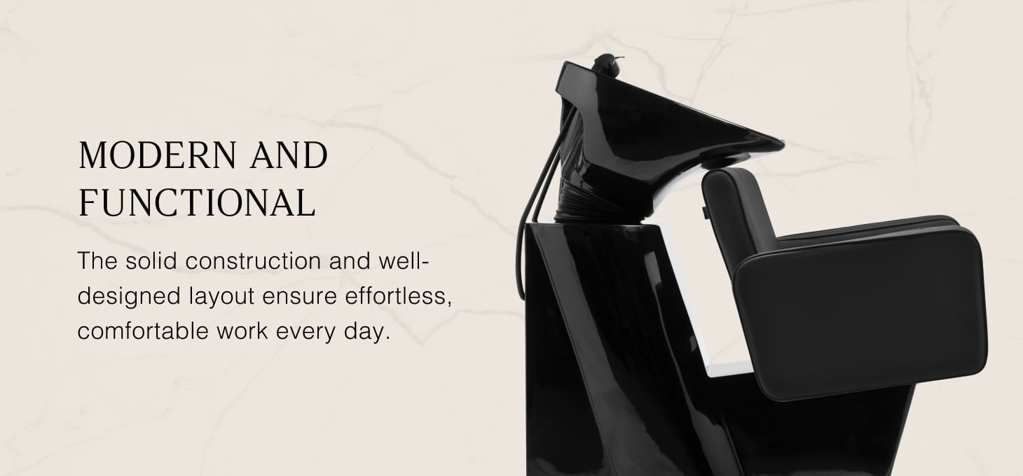 The chair's geometric form with softly rounded edges combines simplicity and comfort in a modern design. The square seat and gently angled armrests create a harmonious whole, ensuring a comfortable position during treatments. The backrest, with its optimal tilt angle, supports proper posture, allowing for complete relaxation. The high-quality black synthetic leather upholstery is resistant and easy to clean. The geometric, modern shape of the furniture emphasises the elegant character of the wash unit and blends in seamlessly with the interior design of the salon. The set includes a complete set of fittings with a matte black finish, including a faucet, shower head, and matching hoses, ensuring a complete set of tools for the job.