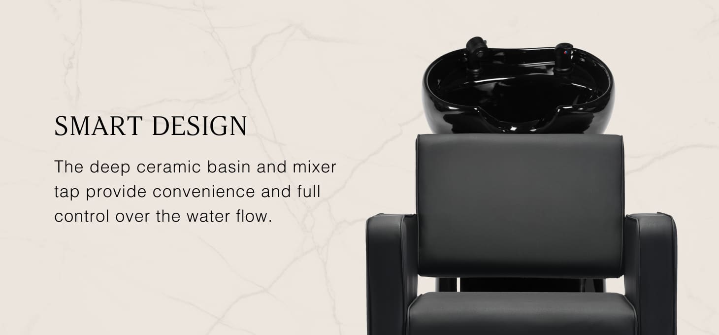 The deep ceramic bowl in shades of black minimises splashing of water and cosmetics during treatments. The adjustable bowl angle allows for precise adjustment to the customer's needs. Made of durable material, it is resistant to discolouration, scratches and chemicals, and its smooth surface makes it easy to keep clean. The ergonomically profiled collar provides comfortable head support, while the black plastic cover eliminates the feeling of cold when touching the ceramic.