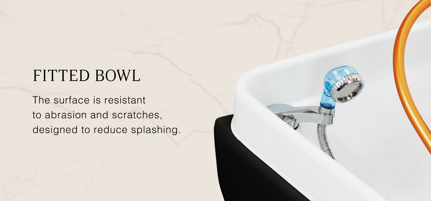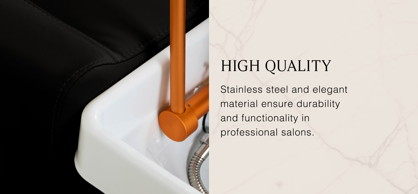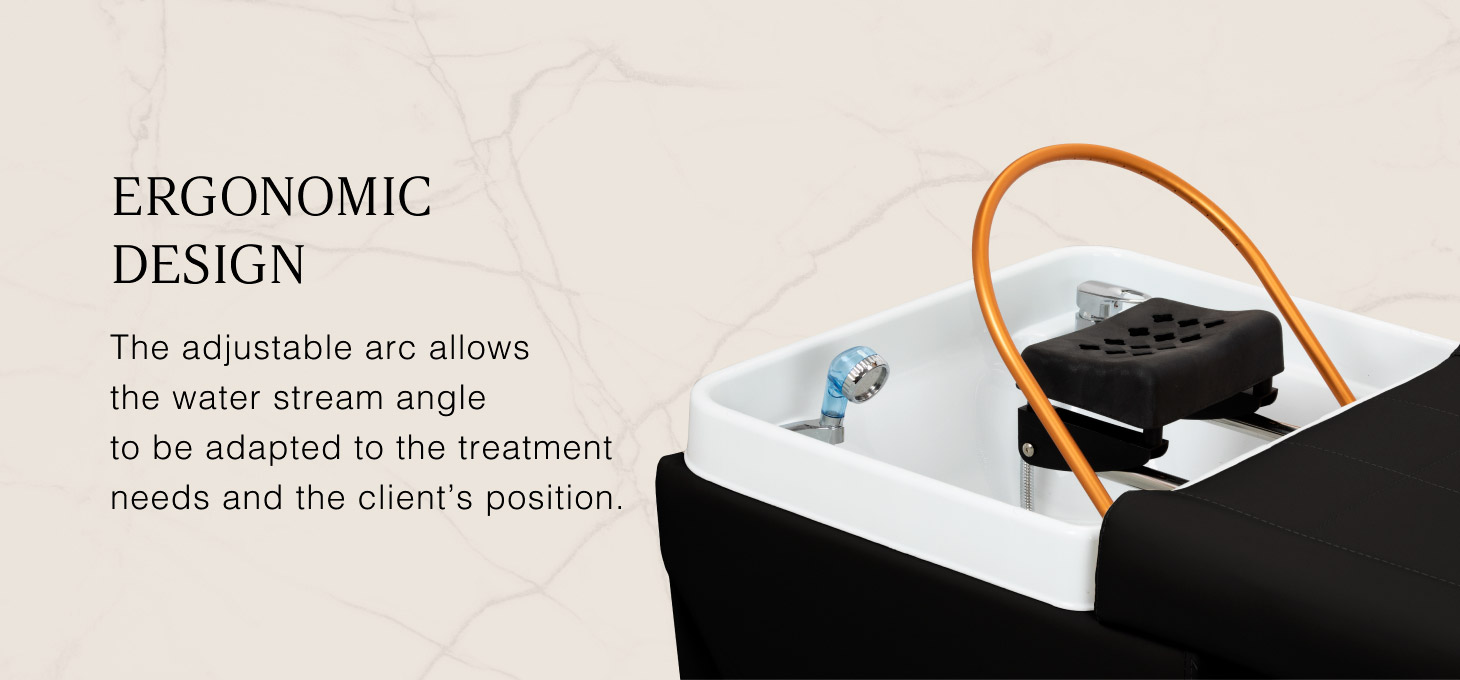 The golden arch with an adjustable inclination angle, designed for the Waterfall Head SPA, is an innovative solution that enables comprehensive scalp care. Water jets act as a natural massage, improving blood circulation, reducing tension and stress, and bringing relief from ailments such as headaches and neck stiffness. Precisely controlled water flow promotes hair regeneration and intensely moisturises the skin. Thanks to an intelligent closed-loop system, the arch draws water from the basin and reuses it, providing a continuous water massage. A combination of technology and relaxation that supports hair health and well-being.