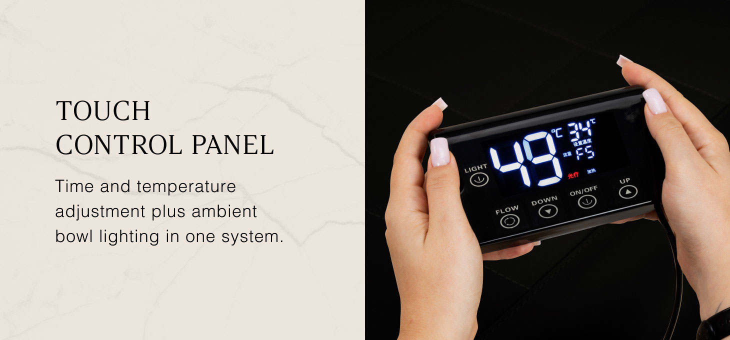 The intuitive touch panel allows for full control over treatment parameters and ease of use. It allows you to adjust the operating time and water temperature, as well as monitor their current values on a clear, easy-to-read display. Additionally, the panel allows you to activate the light therapy function, which illuminates the bowl, creating an atmosphere of relaxation and luxury. The set also includes a remote control, which allows you to conveniently control the steam therapy device from a distance.