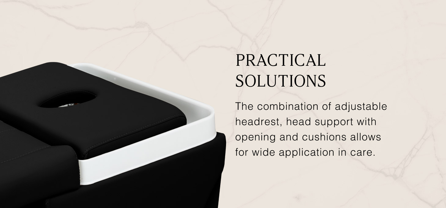 The adjustable headrest, with the option of extending and changing the angle of inclination, allows for a perfect adjustment to the user's needs, ensuring maximum comfort. The set also includes ergonomic cushions, including a headrest with a face opening, which expands the range of applications – from scalp treatments to massages and various body and facial therapies. These practical features make the lounger a versatile piece of equipment for beauty and wellness salons, combining customer comfort with the functionality needed by the professional.