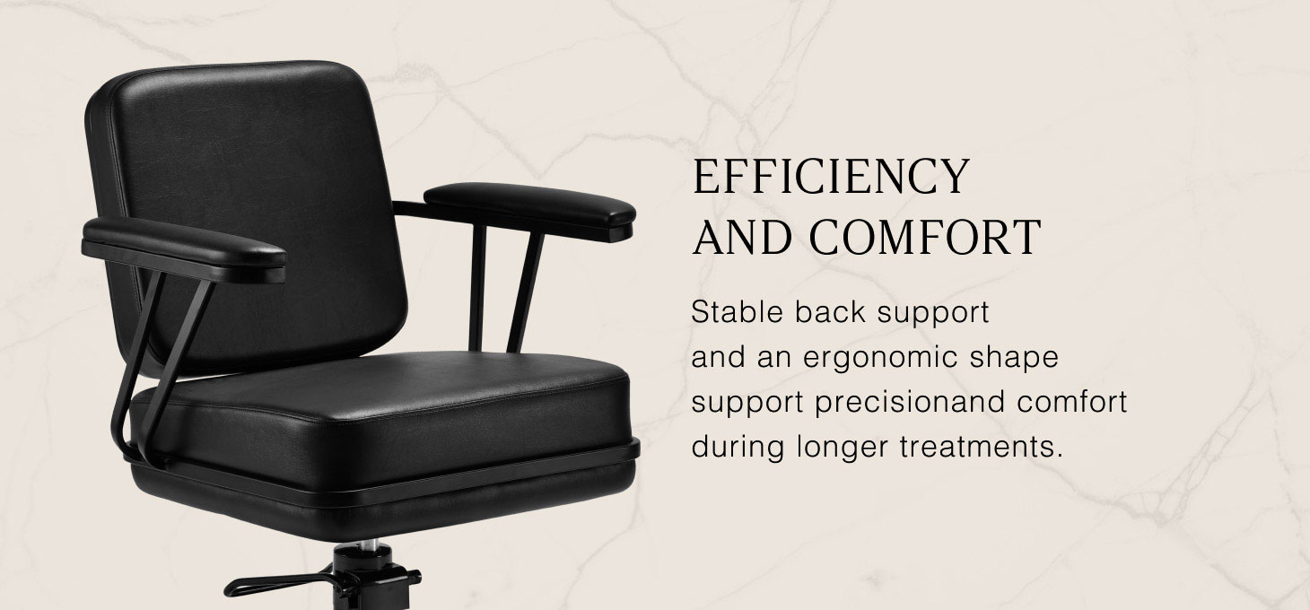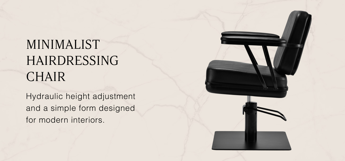 The profiled chair provides lumbar support and high comfort of use, while the upholstered armrests allow for the correct positioning of the client's shoulders. The stable, square base in matte black emphasises the stylish look, and the pleasant-to-touch synthetic leather in shades of black guarantees comfort during long treatments, durability, moisture resistance and ease of cleaning. The modern design gives the interior a unique character, and the chair works well in both modern and classic arrangements, emphasising the professional image of the salon.