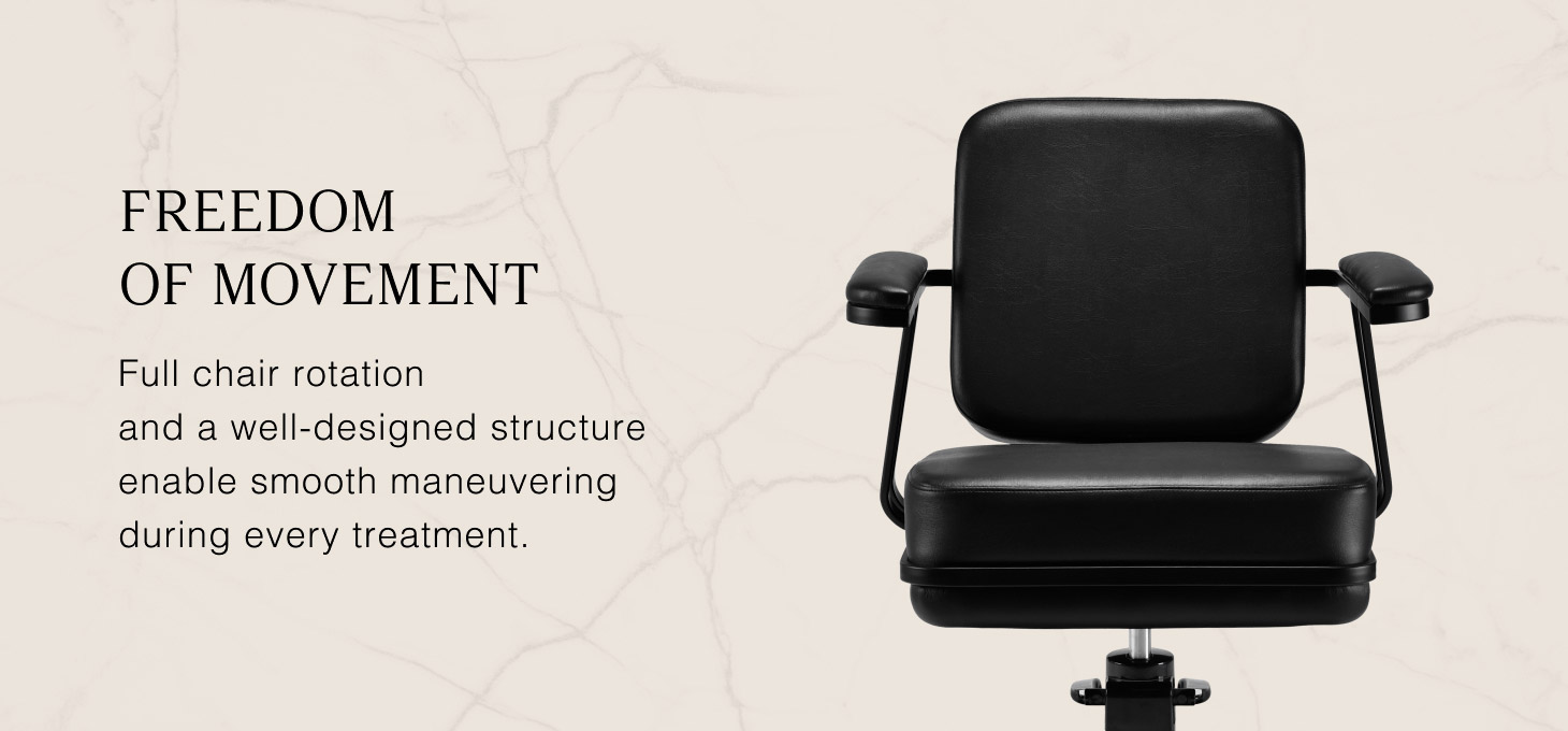 The chair's design has been created with comfort in mind, even during longer treatments. The contoured seat and ergonomic armrests support the customer's natural posture, facilitating the hairdresser's precise work. The full rotation mechanism increases the range of motion and freedom of manoeuvring, which translates into smooth and efficient service.