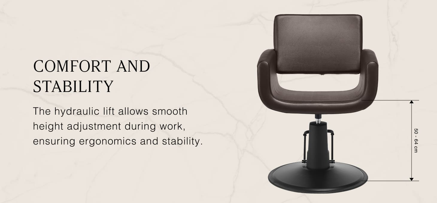 The durable hydraulic lift allows for seat height adjustment from 50 to 64 cm, even during use. This makes work more ergonomic and less strenuous, and the position can be adjusted to suit both the hairdresser's and the customer's height. The comfortable backrest provides stable back support and facilitates a comfortable position, which is especially important during long treatments, increasing customer comfort and satisfaction.