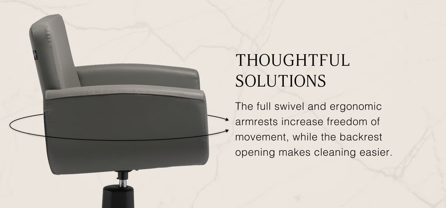 Ergonomic armrests support the client's correct posture, ensuring comfort and facilitating precise cutting and styling. The full rotation mechanism provides greater mobility and freedom of movement, making hairdressing work smoother, more efficient, and less strenuous. A practical opening between the backrest and seat facilitates cleaning and quick hair removal from hard-to-reach areas. This allows for efficient and hygienic preparation of the salon for the next client.