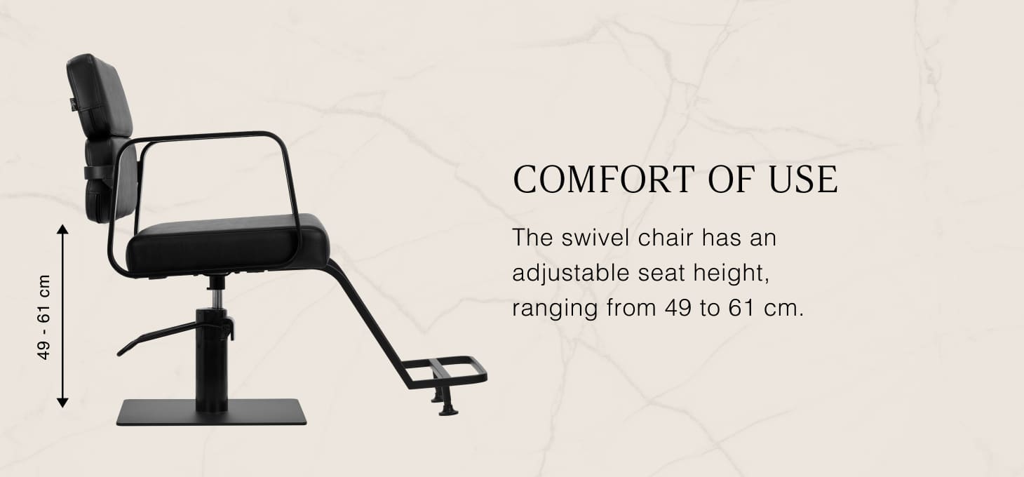 The durable hydraulic lift allows you to adjust the seat level within the range of 49-61 cm - even when the client is sitting on the chair. It ensures more ergonomic work, allowing you to adjust the seat level to the height of both the client and the hairdresser. The visually interesting backrest allows you to take a convenient position, providing excellent back support, which is especially important in the case of long-hour treatments. A big advantage of this model is the hole left between the backrest and the seat. It makes it easier to keep the salon clean by allowing you to easily sweep hair from every nook and cranny of the chair. This allows you to streamline the preparation of the workstation between clients.