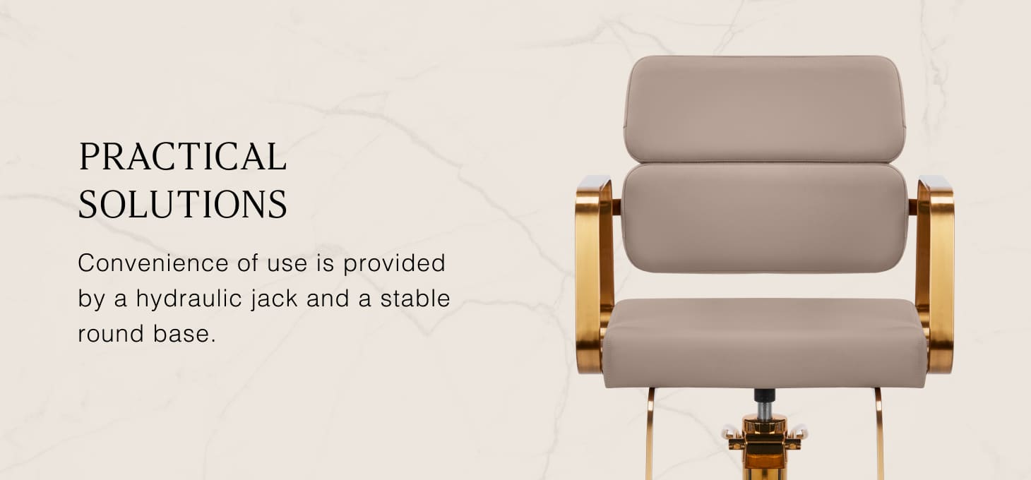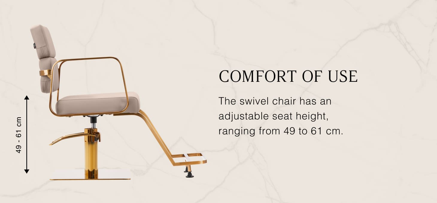The full rotation mechanism of the chair makes the hairdresser's work more effective and comfortable. A solid, flat, square-shaped base guarantees stability during use. The matte-finished, smooth surface gives the element an elegant look and makes it easy to keep clean. A comfortable seat with foam filling ensures high comfort of use, even during many hours of treatments. Geometric, metal armrests in shades of gold allow for the correct positioning of the client's shoulders – this means that he does not bury his head in his shoulders or slouch – which makes it much easier to perform precise treatments, including haircuts. A stylish footrest dedicated to this model provides stable support for the user's feet.