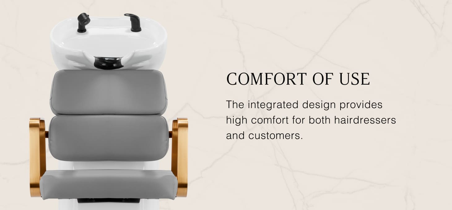 The profiled chair provides adequate lumbar support and, therefore, high comfort of use. Metal armrests in shades of gold with a geometric shape allow for the correct positioning of the customer's shoulders. Filling with durable, deformation-resistant foam and upholstery made of pleasant-to-touch synthetic leather in shades of gray ensure the durability of the furniture, ease of cleaning and comfortable use for a long time. The original, elegant appearance of the hair wash unit gives the interior a unique expression. The set includes complete fittings in shades of black, including a faucet, a shower head and dedicated hoses to provide a complete set of tools for work.