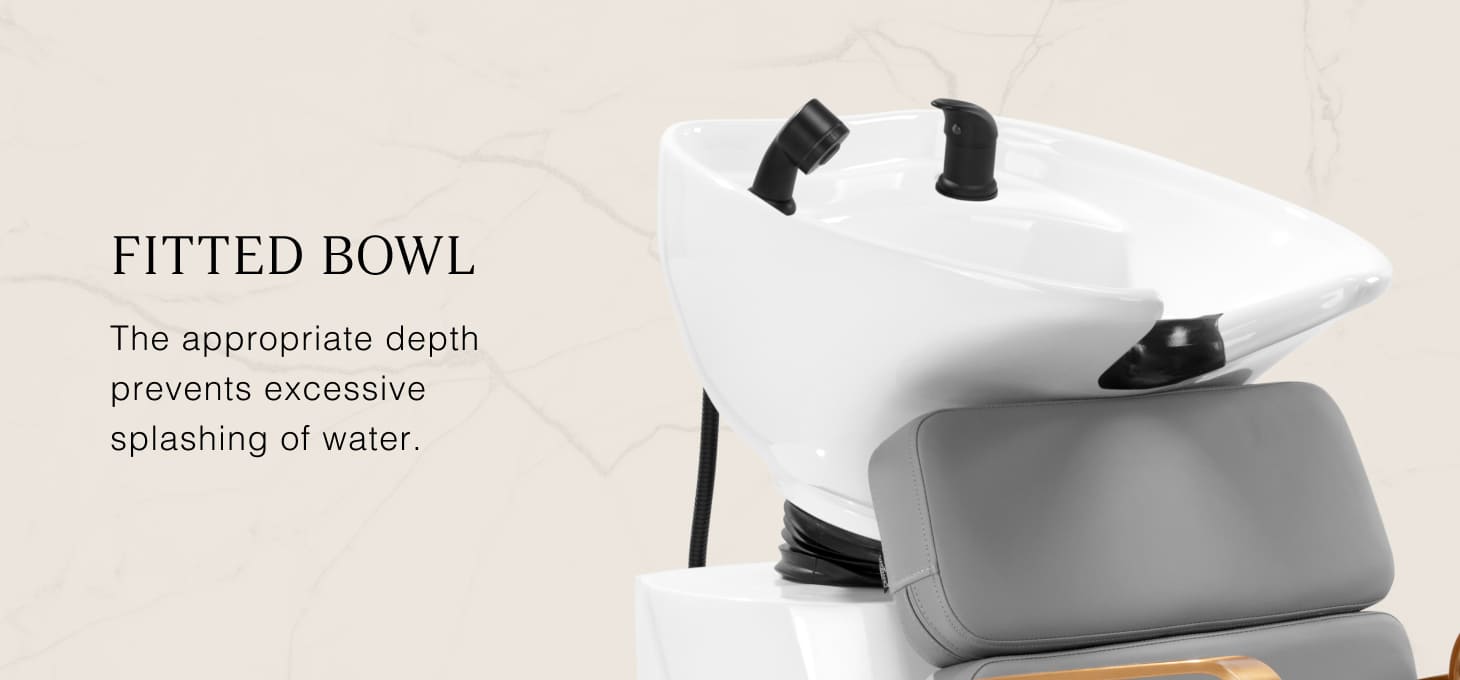 The appropriate depth of the white ceramic washbasin bowl prevents excessive splashing of water or products used during treatments. This allows for comfortable and effective performance of a wide range of services. The angle of the bowl can be adjusted, making it easy to adapt to individual needs. The high quality of the materials used makes the washbasin durable, resistant to discoloration and scratches, and very easy to clean. A properly profiled collar and inclined backrest provide support and comfort when washing the hair, and thanks to the comfortable black plastic overlay, the customer will not feel the unpleasantness of the cold ceramic surface.
