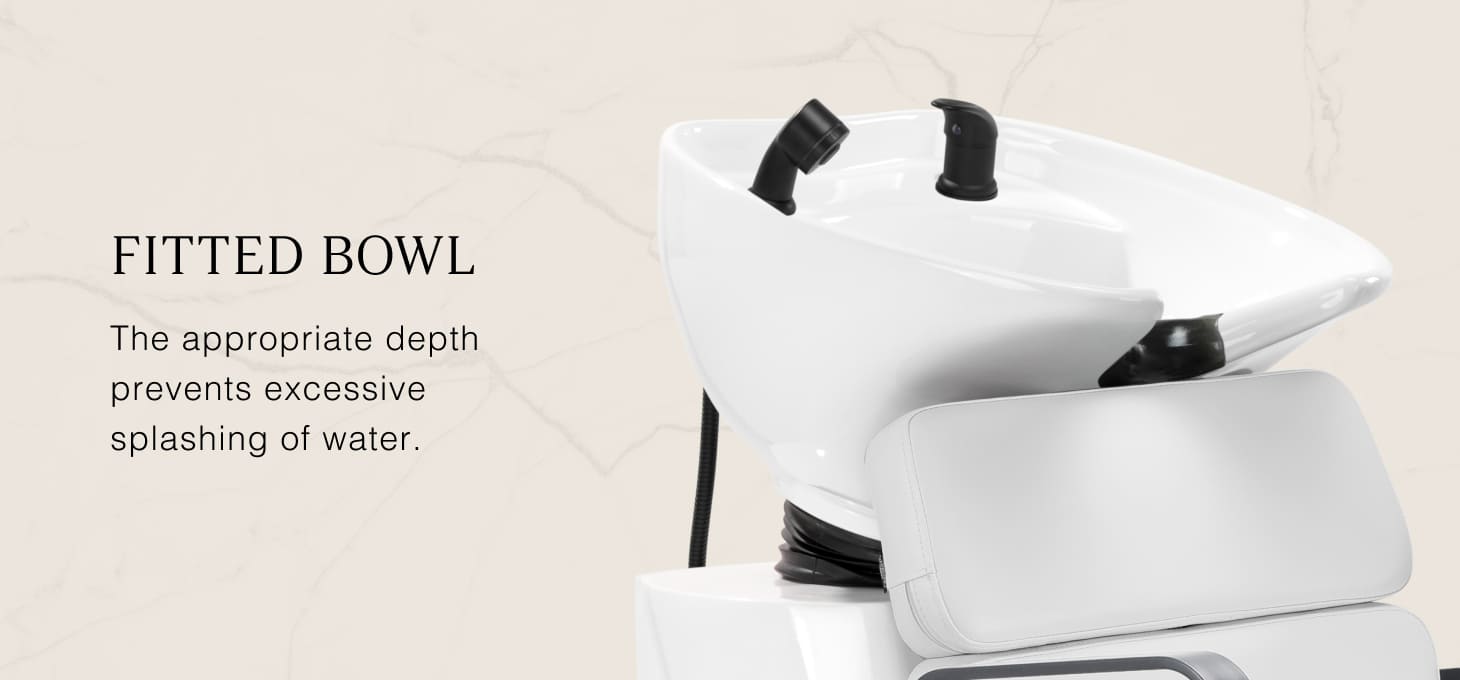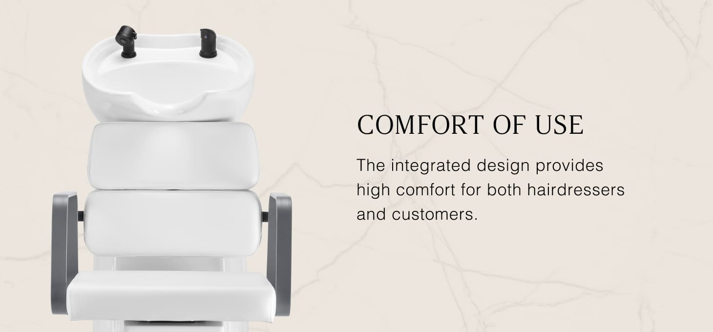 The appropriate depth of the white ceramic washbasin bowl prevents excessive splashing of water or products used during treatments. This allows for comfortable and effective performance of a wide range of services. The angle of the bowl can be adjusted, making it easy to adapt to individual needs. The high quality of the materials used makes the washbasin durable, resistant to discoloration and scratches, and very easy to clean. A properly profiled collar and inclined backrest provide support and comfort when washing the hair, and thanks to the comfortable black plastic overlay, the customer will not feel the unpleasantness of the cold ceramic surface.