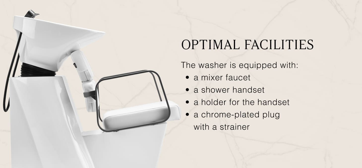 The practical hair wash unit is equipped with a mixer faucet, which provides easy access to hot and cold water. This makes it easier to adjust the temperature to the customer's individual preferences. A dedicated place to hang up the handset makes work easier, and the chrome-plated plug with a special strainer allows you to control the water flow and maintain high hygiene standards in the salon. The water connection has been placed inside the base, allowing the pipes to be easily hidden. A significant advantage of this model is the opening left between the backrest and the seat, which makes it easier to keep the living room clean by allowing you to easily sweep dirt from every nook and cranny of the chair. The hair wash unit has been designed in such a way as to ensure comfort during various treatments, ensuring proper back support. The combination of functionality and amenities makes working in a hairdressing salon even more comfortable.