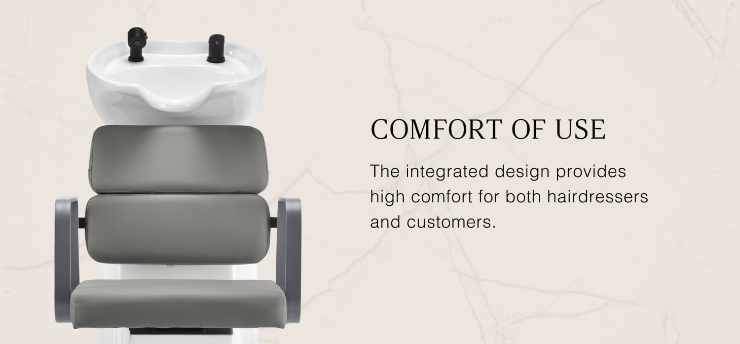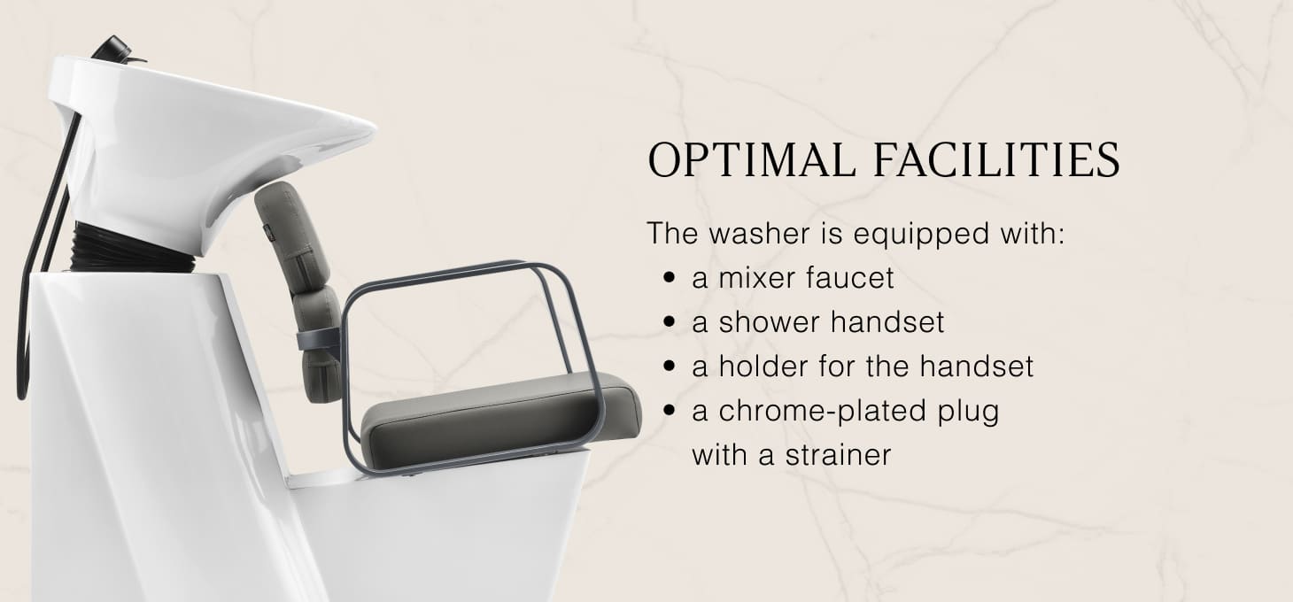 The practical hair wash unit is equipped with a mixer faucet, which provides easy access to hot and cold water. This makes it easier to adjust the temperature to the customer's individual preferences. A dedicated place to hang up the handset makes work easier, and the chrome-plated plug with a special strainer allows you to control the water flow and maintain high hygiene standards in the salon. The water connection has been placed inside the base, allowing the pipes to be easily hidden. A significant advantage of this model is the opening left between the backrest and the seat, which makes it easier to keep the living room clean by allowing you to easily sweep dirt from every nook and cranny of the chair. The hair wash unit has been designed in such a way as to ensure comfort during various treatments, ensuring proper back support. The combination of functionality and amenities makes working in a hairdressing salon even more comfortable.