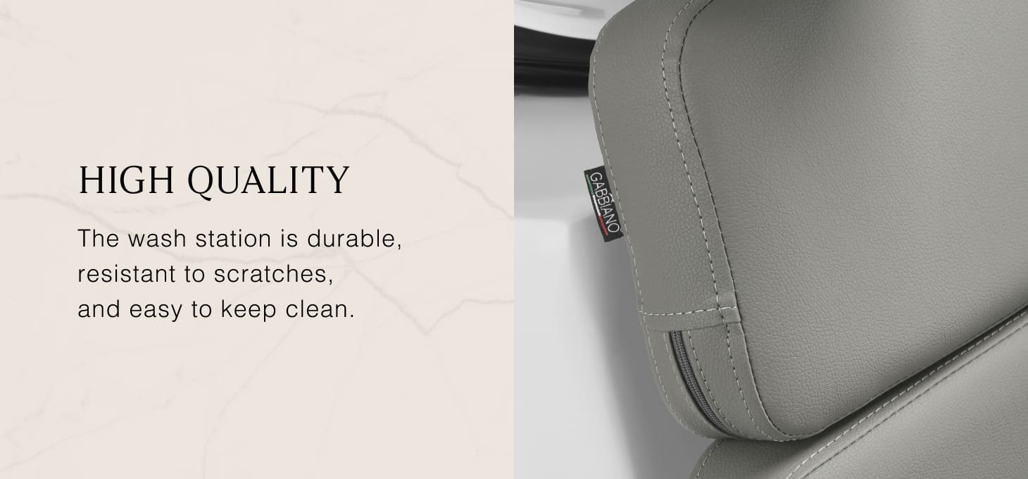 The profiled chair provides adequate lumbar support and, therefore, high comfort of use. Metal armrests in shades of gry with a geometric shape allow for the correct positioning of the customer's shoulders. Filling with durable, deformation-resistant foam and upholstery made of pleasant-to-touch synthetic leather in shades of gray ensure the durability of the furniture, ease of cleaning and comfortable use for a long time. The original, elegant appearance of the hair wash unit gives the interior a unique expression. The set includes complete fittings in shades of black, including a faucet, a shower head and dedicated hoses to provide a complete set of tools for work.