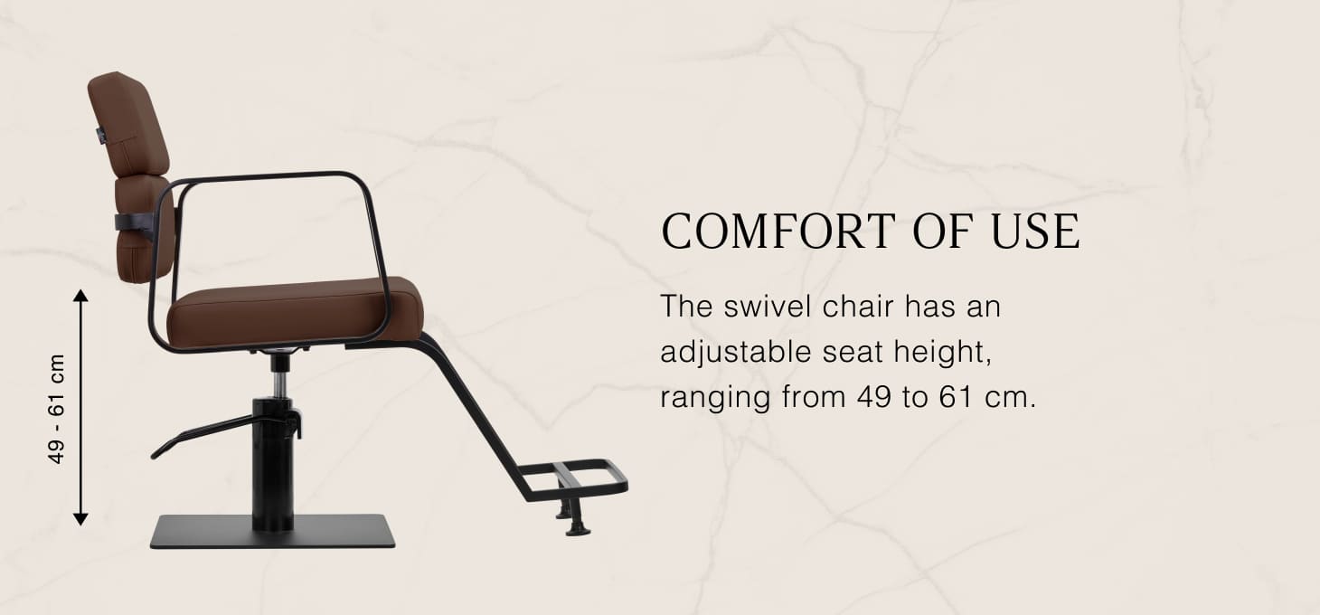 The durable hydraulic lift allows you to adjust the seat level within the range of 49-61 cm - even when the client is sitting on the chair. It ensures more ergonomic work, allowing you to adjust the seat level to the height of both the client and the hairdresser. The visually interesting backrest allows you to take a convenient position, providing excellent back support, which is especially important in the case of long-hour treatments. A big advantage of this model is the hole left between the backrest and the seat. It makes it easier to keep the salon clean by allowing you to easily sweep hair from every nook and cranny of the chair. This allows you to streamline the preparation of the workstation between clients.