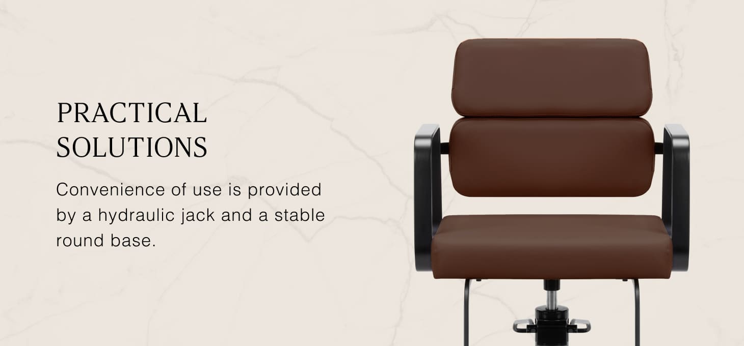 The full rotation mechanism of the chair makes the hairdresser's work more effective and comfortable. A solid, flat, square-shaped base guarantees stability during use. The matte-finished, smooth surface gives the element an elegant look and makes it easy to keep clean. A comfortable seat with foam filling ensures high comfort of use, even during many hours of treatments. Geometric, metal armrests allow for the correct positioning of the client's shoulders – this means that he does not bury his head in his shoulders or slouch – which makes it much easier to perform precise treatments, including haircuts. A stylish footrest dedicated to this model provides stable support for the user's feet.