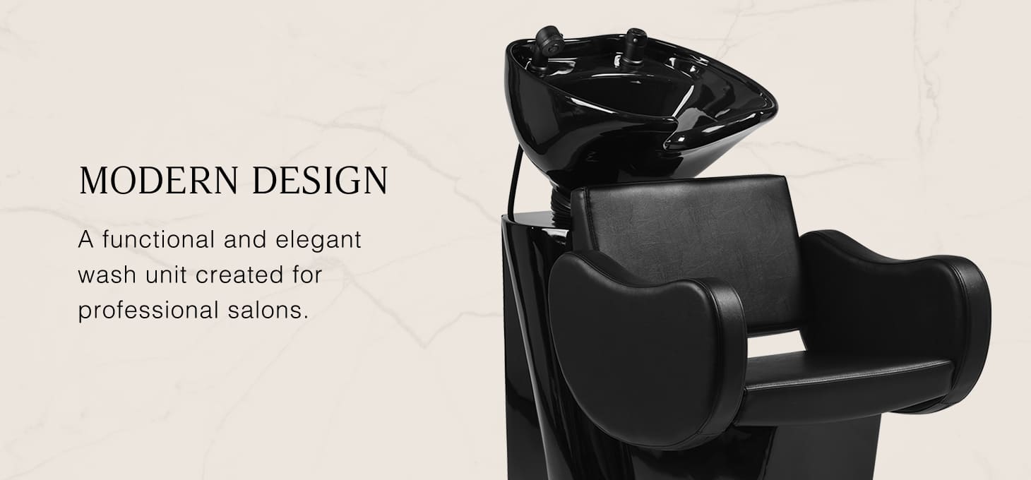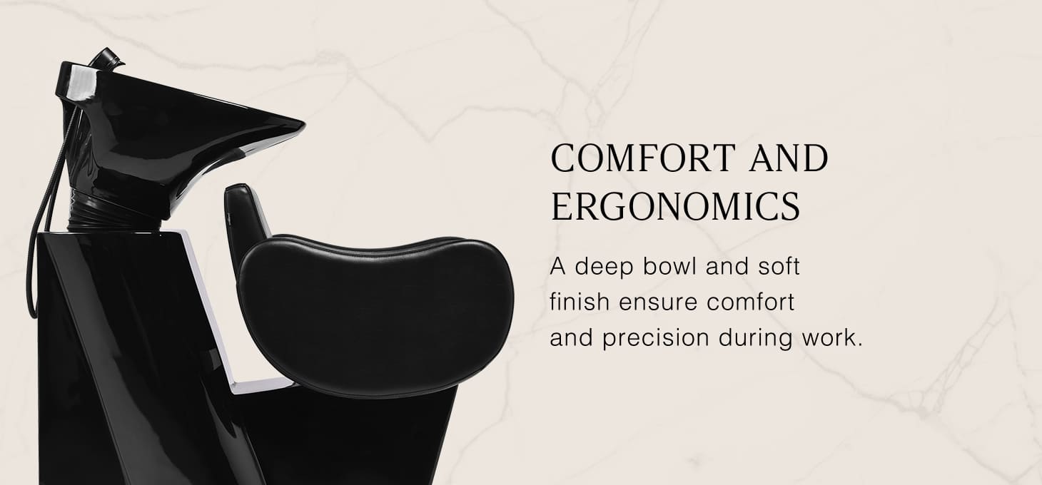 The deep ceramic bowl in shades of black reduces splashing of water and products used during treatments. The adjustable bowl tilt allows for customization to suit individual needs, and the material used makes the sink durable, resistant to stains and scratches, and easy to keep clean. The ergonomically profiled collar provides comfortable head support, while the soft black plastic cover eliminates the feeling of coldness from the ceramic surface.