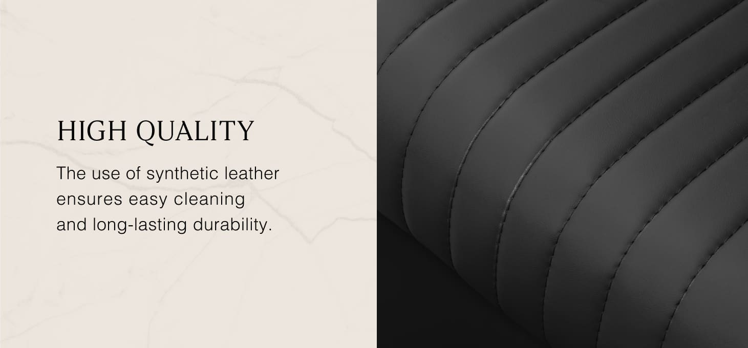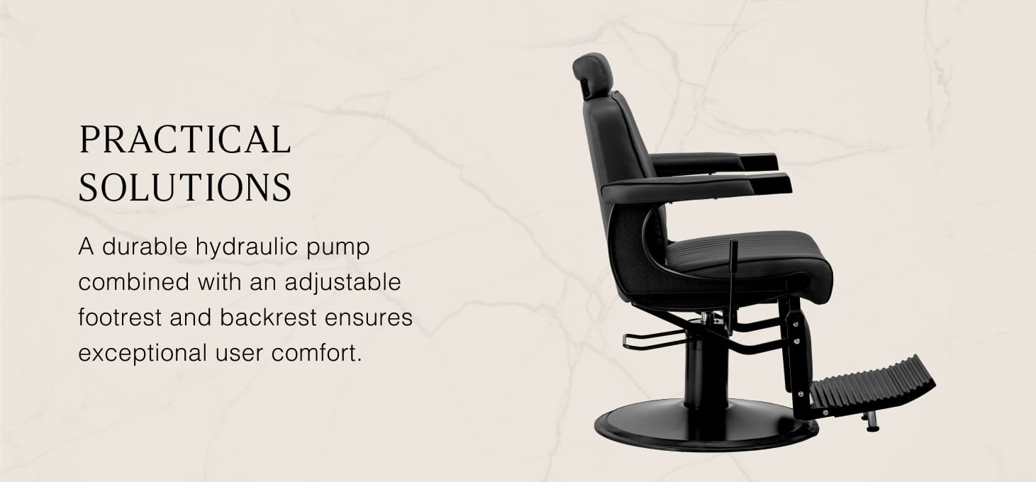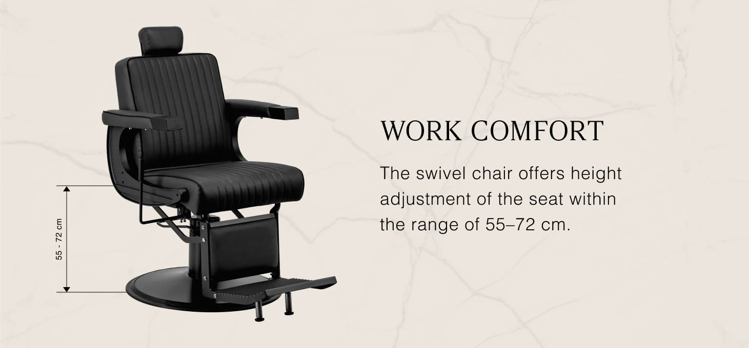 Sturdy base construction ensures stability and high comfort. The seat is filled with deformation-resistant foam and upholstered with soft, matt synthetic leather, combining durability with comfort. The materials used for the finish are moisture-resistant, durable and easy to clean, making the chair perfect for everyday use. Stylish stitching and upholstery in shades of black give it a unique character, blending perfectly with the décor of modern barbershops.