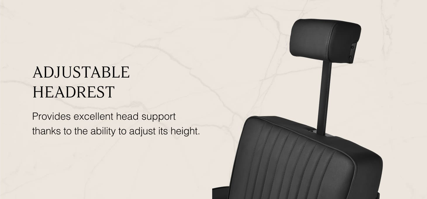 An efficient hydraulic lift allows for free seat height adjustment within a range of 55-72 cm, even when the client is already seated in the chair. This allows the chair to be ergonomically adapted to the height of the client and the preferences of the practitioner. The reclining backrest and adjustable footrest allow the client to be placed in a comfortable, semi-reclining position for easy access during more precise services. Additional support is provided by an extendable headrest, ensuring stable head support.