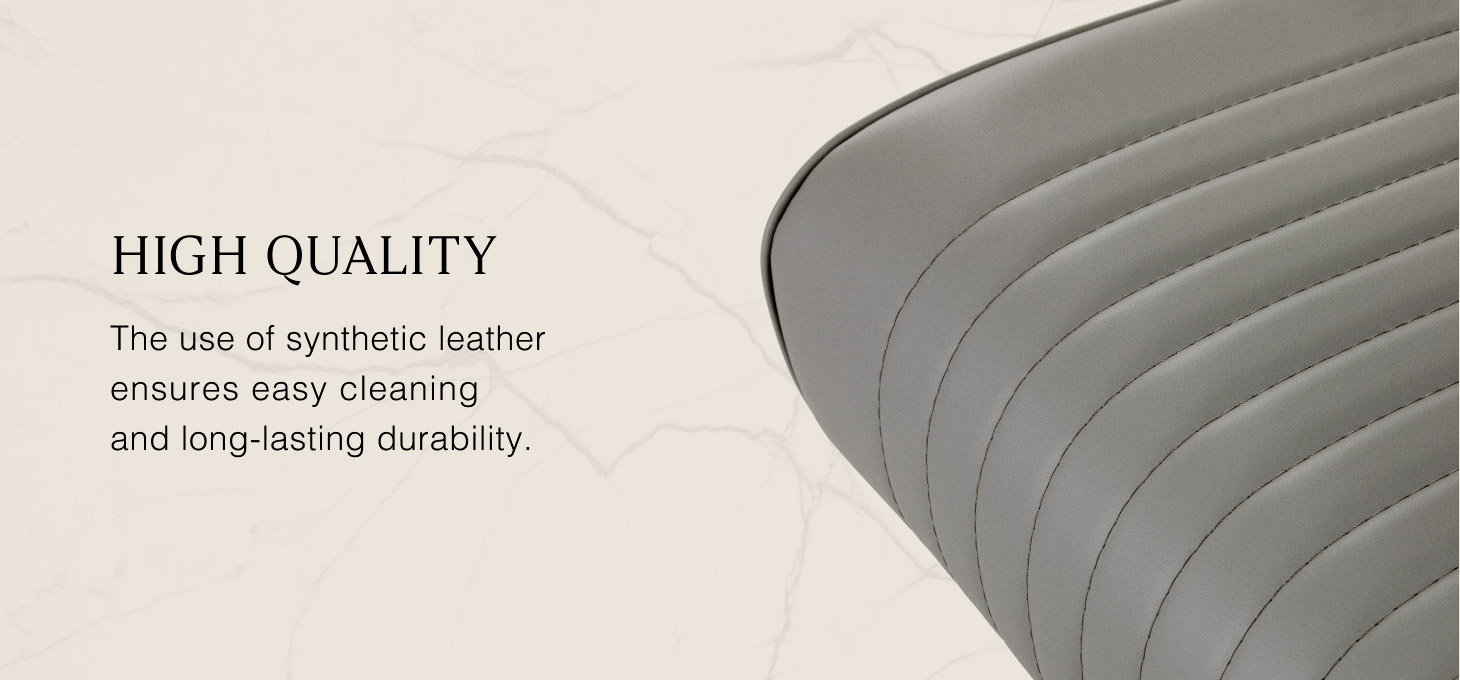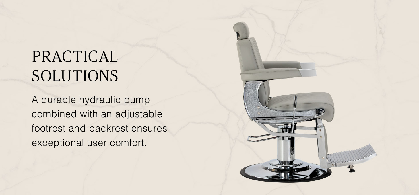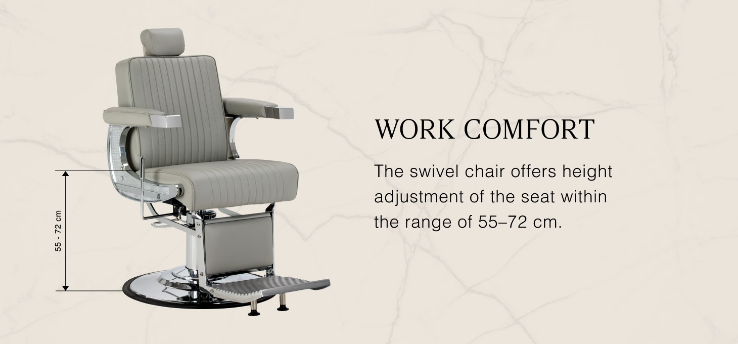 Sturdy base construction ensures stability and high comfort. The seat is filled with deformation-resistant foam and upholstered with soft, matt synthetic leather, combining durability with comfort. The materials used for the finish are moisture-resistant, durable and easy to clean, making the chair perfect for everyday use. Stylish stitching and upholstery in shades of grey give it a unique character, blending perfectly with the décor of modern barbershops.