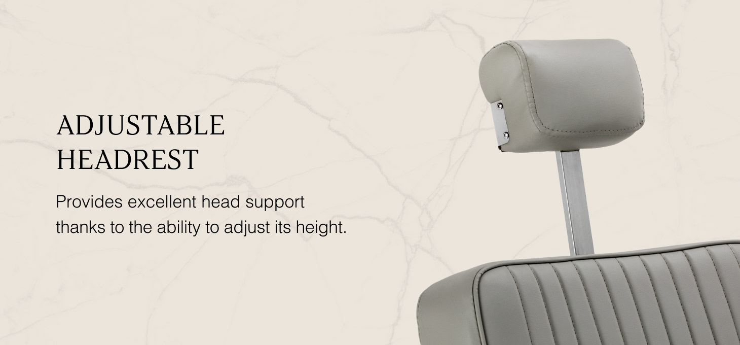 An efficient hydraulic lift allows for free seat height adjustment within a range of 55-72 cm, even when the client is already seated in the chair. This allows the chair to be ergonomically adapted to the height of the client and the preferences of the practitioner. The reclining backrest and adjustable footrest allow the client to be placed in a comfortable, semi-reclining position for easy access during more precise services. Additional support is provided by an extendable headrest, ensuring stable head support.