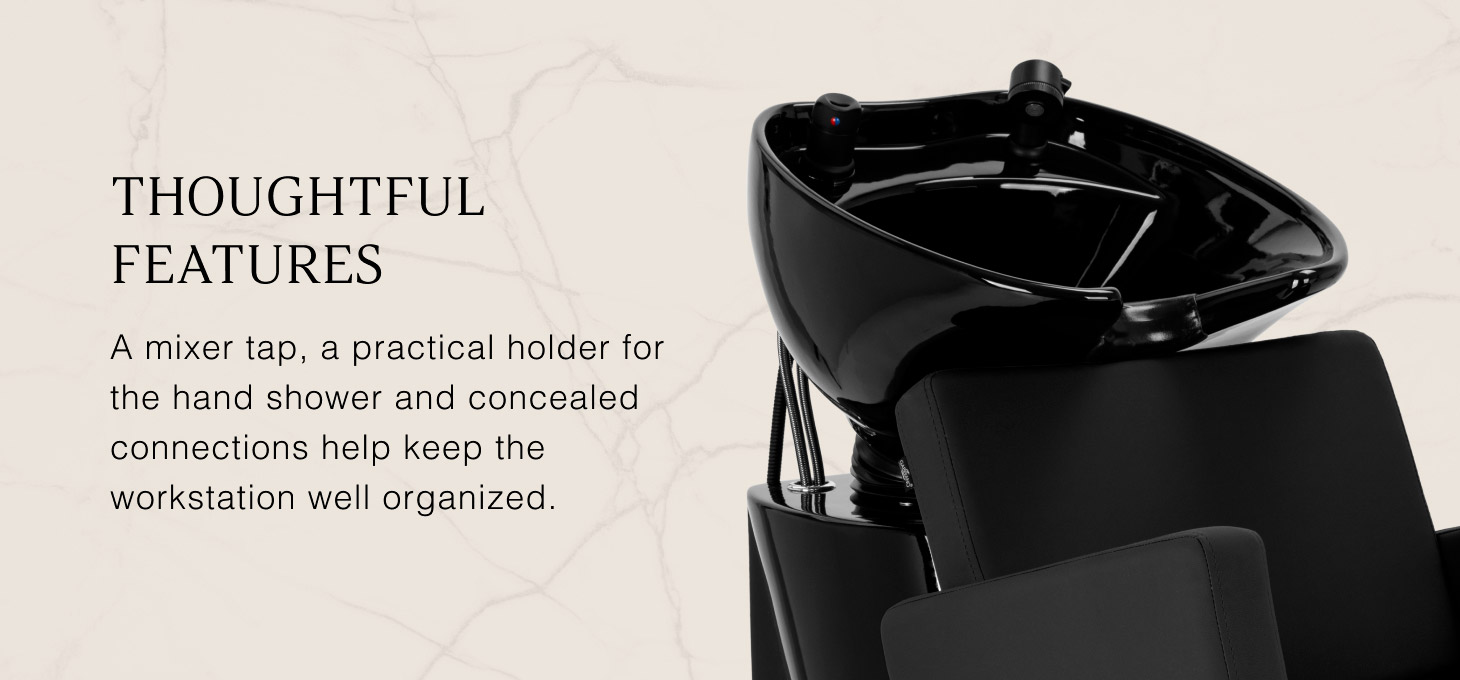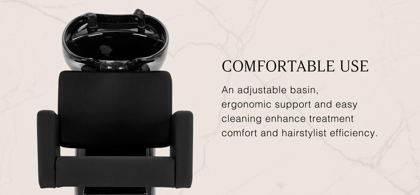 The deep ceramic bowl in shades of black minimises splashing of water and cosmetics during treatments. The adjustable angle of the bowl allows for precise adjustment to the customer's needs. Made of durable material, it is resistant to discolouration, scratches and chemicals, and its smooth surface makes it easy to keep clean. The ergonomically contoured collar provides comfortable head support, and the black plastic cover eliminates the feeling of cold when in contact with the ceramic.