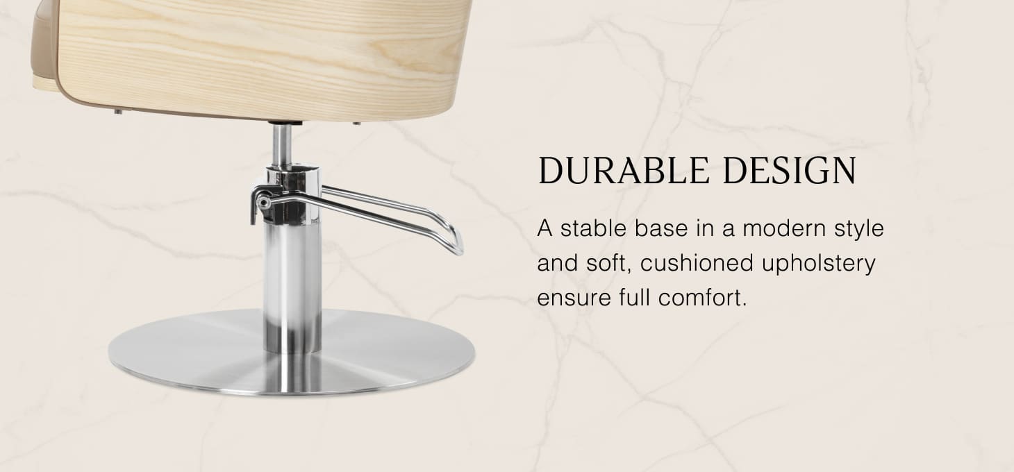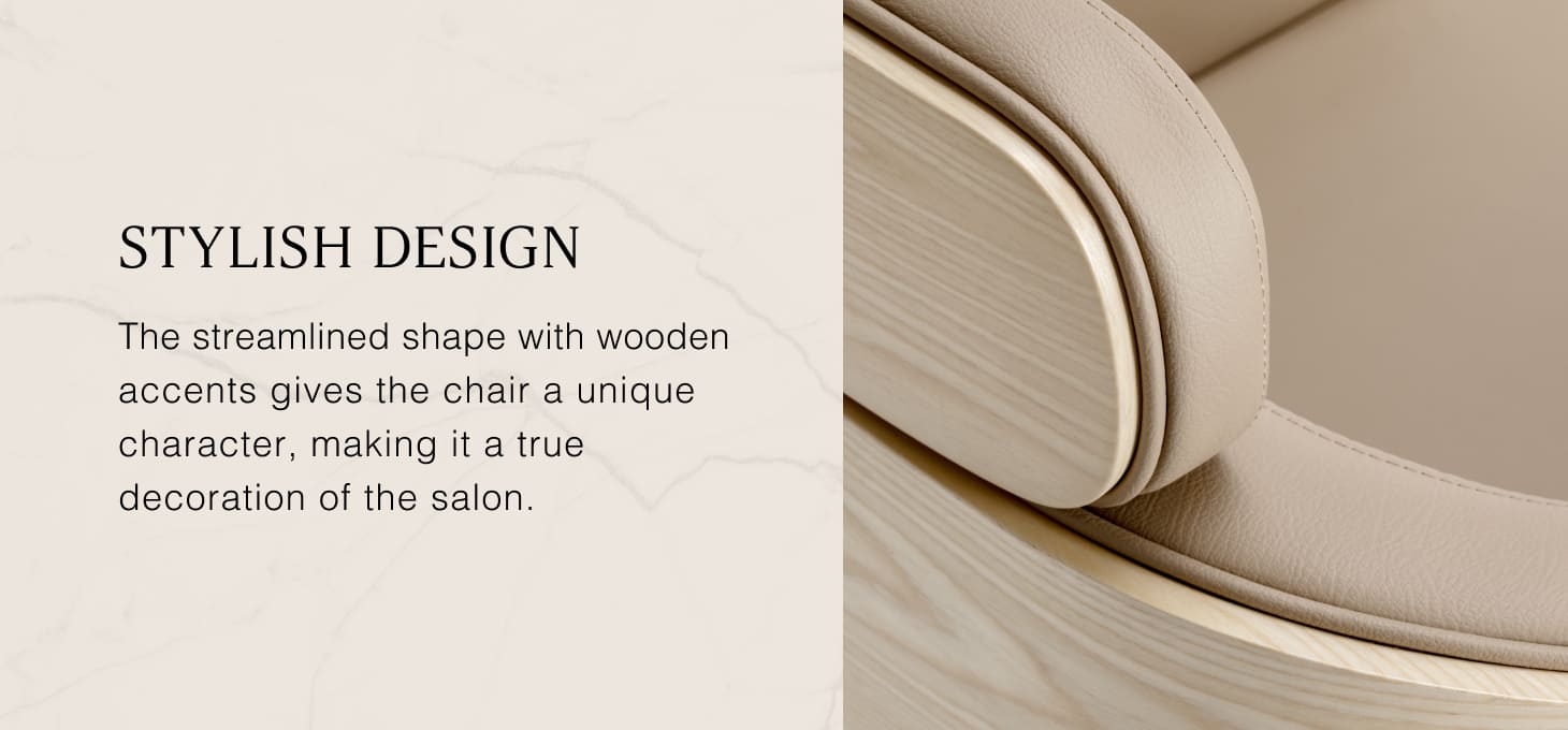 The Gabbiano Wratislavia hairdressing chair combines minimalist design with functionality and comfort for everyday use. Wooden elements on the outside of the structure add warmth and style, while the streamlined shapes add give it a light and modern character. The stable, round base in shades of chrome emphasizes its modern character, while the soft foam filling combined with the pleasant-to-the-touch synthetic leather in shades of taupe guarantees comfort even during long treatments. Carefully selected materials make it durable, moisture-resistant, and easy to clean. It fits perfectly into both modern and classic interiors, emphasising the professional character of any salon.