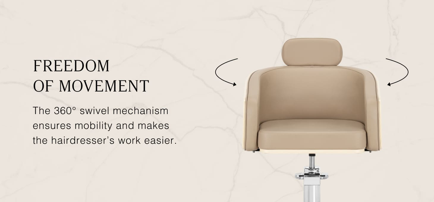 The foam-filled seat provides high comfort even during long treatments. The full rotation mechanism increases mobility and freedom of movement, making the hairdressers' work smoother, more efficient and less strenuous. The armrests support the client's correct posture, which promotes a comfortable seating position and enabling precise styling and cutting.