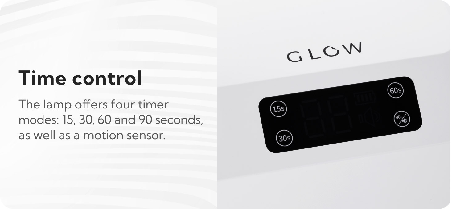 The lamp has a timer with four pre-programmed operating times: 15 s, 30 s, 60 s and 90 s ( "Low Heat Mode"), displayed on a clear digital screen. A built-in motion sensor automatically activates the device when you insert your hand or foot, using the last selected time option. The screen displays the elapsed curing time, allowing you to precisely adjust the exposure time to the styling you are performing.