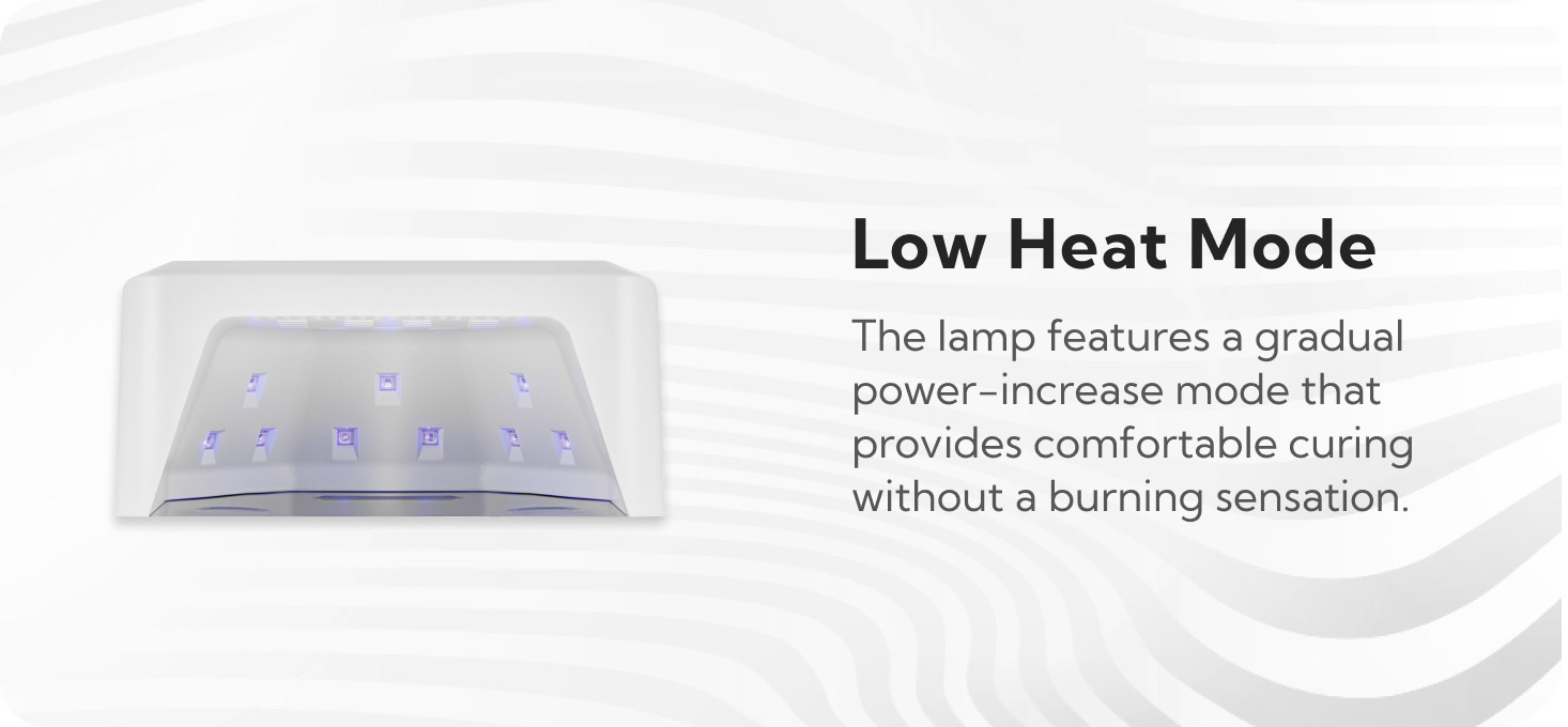 When Low Heat Mode is activated , the lamp heats up gradually, slowly increasing the power, which allows for comfortable curing without a burning or hot sensation. This function is particularly useful for gels that can cause discomfort. This makes the curing process more comfortable and protects the nails from excessive heat.