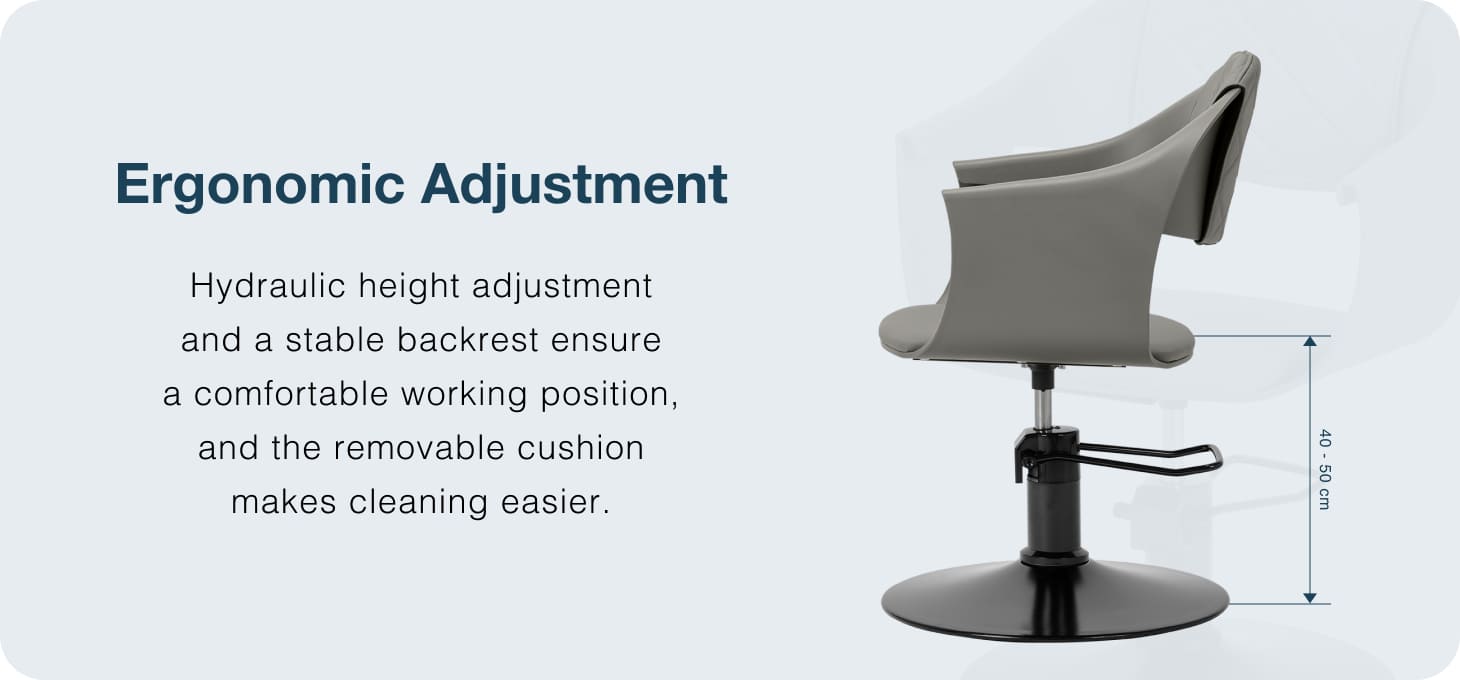 The durable hydraulic lift makes it possible to adjust the seat height within 40-50 cm - also during use. This allows the chair to be adjusted to the client's height and the hairdresser's preferences, promoting an ergonomic working position. The backrest provides stable back support, which is particularly useful during long treatments. For added comfort, the chair is fitted with a cushion covered with synthetic leather and fastened with Velcro - a solution that makes cleaning and maintenance easier.