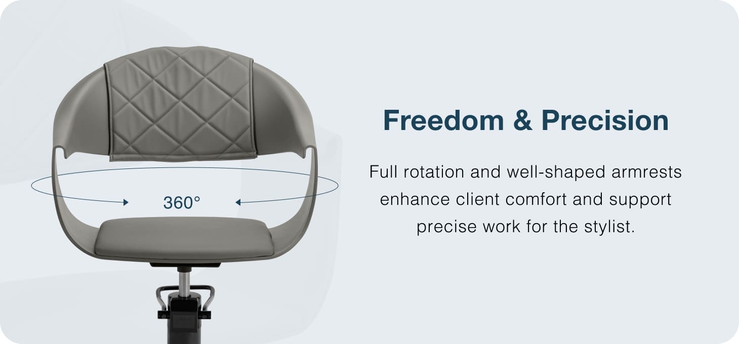 The chair is equipped with a full rotation mechanism to provide the hairdresser with freedom of movement and comfort during work. The plastic armrests, placed at the right height, allow the client's shoulders to be positioned correctly, preventing hunching and bending of the head. The ergonomic design makes it easy to perform precision treatments, while the robust finish enhances the chair's durability and comfort - for both shorter and longer services.